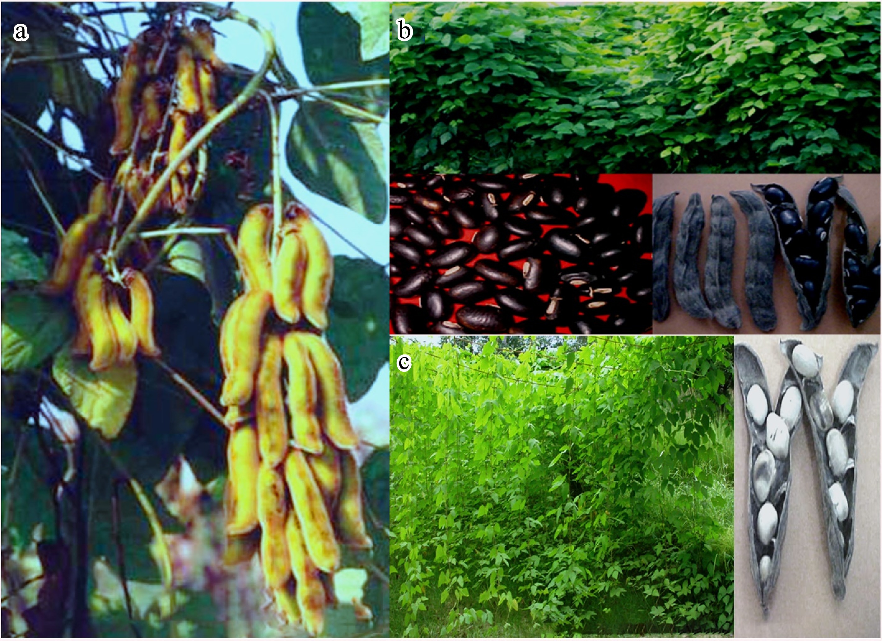 Trichomeless varieties of (a) CIM Ajar, (b) CIM-Nirom, and (c) wild collection with trichomes of Mucuna pruriens.