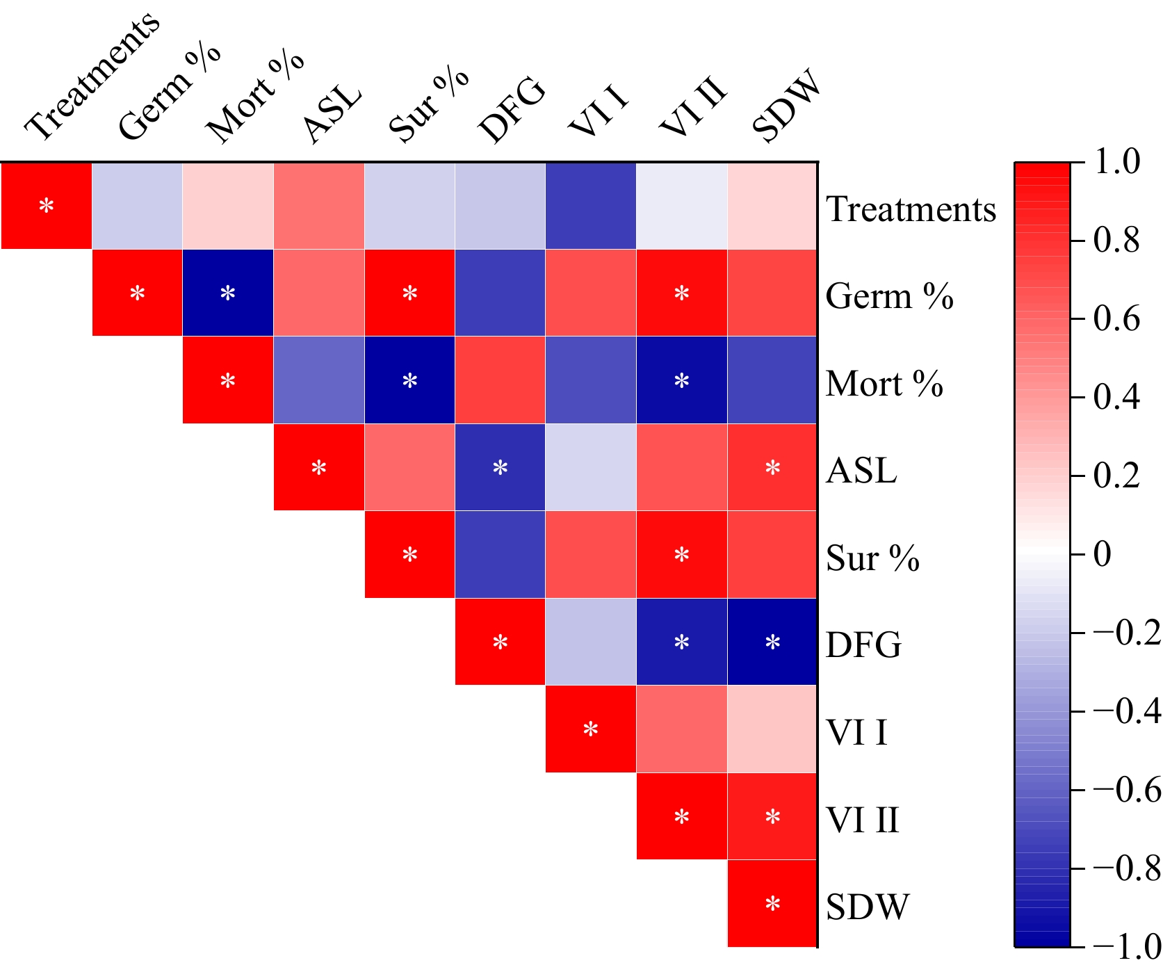 The correlation matrix provides insights into the degree of association between different variables. From the results, a strong positive correlation (r = 0.996) was observed between germination % and survival %, indicating that higher germination rates are strongly associated with better seedling survival. Similarly, a strong positive correlation (r = 0.956) was found between germination % and vigor index II, suggesting that seeds with higher germination rates tended to exhibit better overall vigor (Fig. 5). On the other hand, a strong negative correlation was observed between mortality % and germination % (r = −0.99), as well as between days to germination and seedling dry weight (r = −0.991). This implies that seeds that germinate faster tend to produce seedlings with higher dry weight, indicating that early germination is advantageous for seedling development. Additionally, negative correlations were noted between days to germination and vigor index (r = −0.896) and between seedling length and days to germination (r = −0.812) (Fig. 5). These findings highlight that early and high germination rates are critical for overall seedling success. Reducing the time to germination may enhance multiple seedling characteristics, and selecting for high germination percentages is likely to improve survival rates.