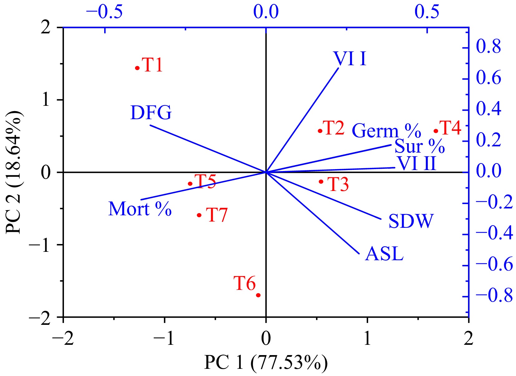 Principal component analysis (PCA) for treatments with germination-related traits in Mucuna pruriens [T1 (control), T2 (hot water 80 °C for 5 min), T3 (normal water for 24 h), T4 (H2SO4 1% for 5 h), T5 (KNO3 1% + HNO3 1% for 24 h), T6 (GA3 500 ppm for 24 h), and T7 (thiourea for 24 h); ASL = Average seedling length; DFG = Days for germination; GP/Germ% = Germination (%); Mort% = Mortality (%); SDW= Seedling Dry Weight; SP/Sur% = Survival (%); VI I = Vigour index 1; VI II = Vigour Index 2].
