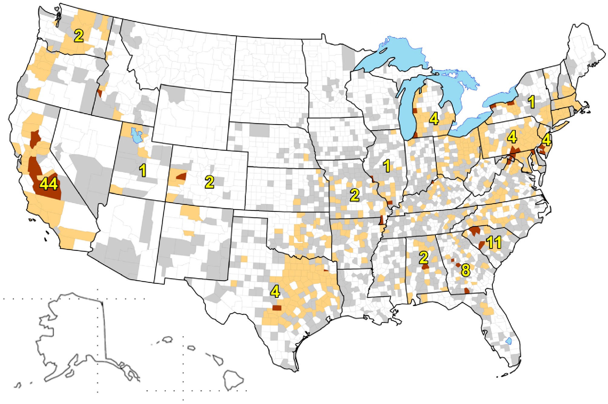 U.S. major (red, accounting for 75%), and minor (orange, 24%) peach production areas and acreage percentages (yellow numbers) in each state to the national total. Grey color represented areas or counties with data not published by NASS and hence not used in delineating the major and minor agricultural areas. States not numbered contributed to less than 1% of the national total acreage. The percentages were derived from USDA NASS 2007 Census of Agriculture data. Additional information on these data can be found at www.nass.usda.gov/AgCensus. This figure was modified slightly from its original USDA version at https://ctgpublishing.com/united-states-strawberry-production/united-states-top-peaches-producing-areas-map/.