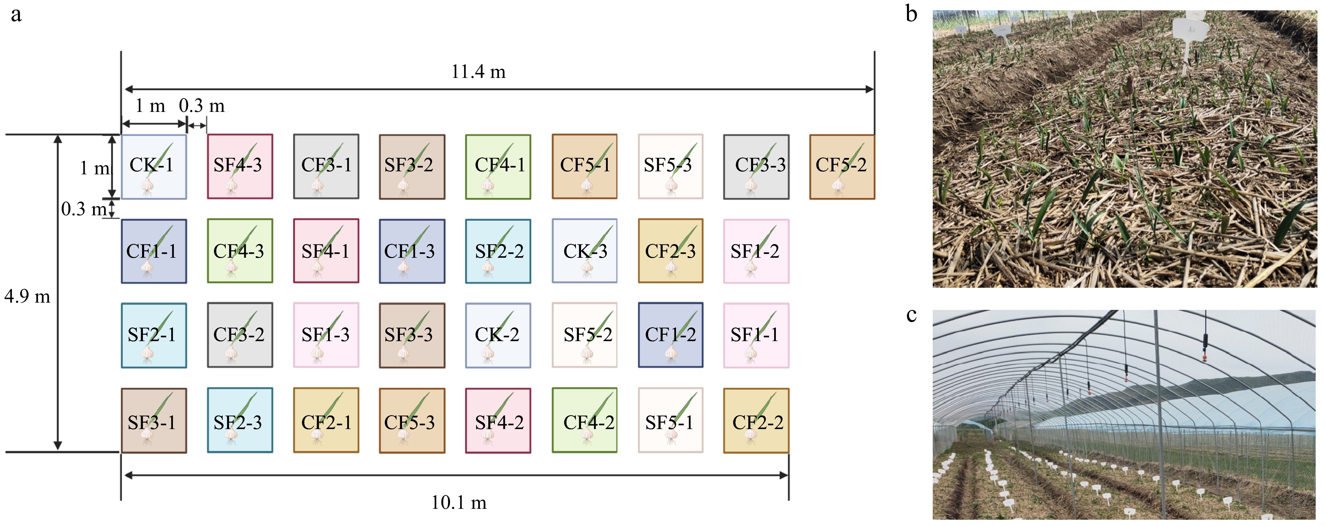• The field experiment consisted of three treatments: blank control (CK) treatment, sheep manure organic fertilizer (SF) treatment, and cow manure organic fertilizer (CF) treatment. Each treatment and control group had three replicates, totaling 33 plots with 162 plants per plot. The area of each plot was 1 m × 1 m, in Fig. 1a. Figure 1b and c present a photographic documentation of the experimental field and the surrounding environment. Before planting F. unibracteata bulbs in October 2022, all organic fertilizers were applied simultaneously, mixed well with the soil, and applied to a depth of 15−20 cm. The plots were then mulched to a height of 5−7 cm above the ground. Other field management measures were similar to conventional local practices. Before fertilization, the physicochemical properties of CF and SF were determined (Supplementary Table S1).