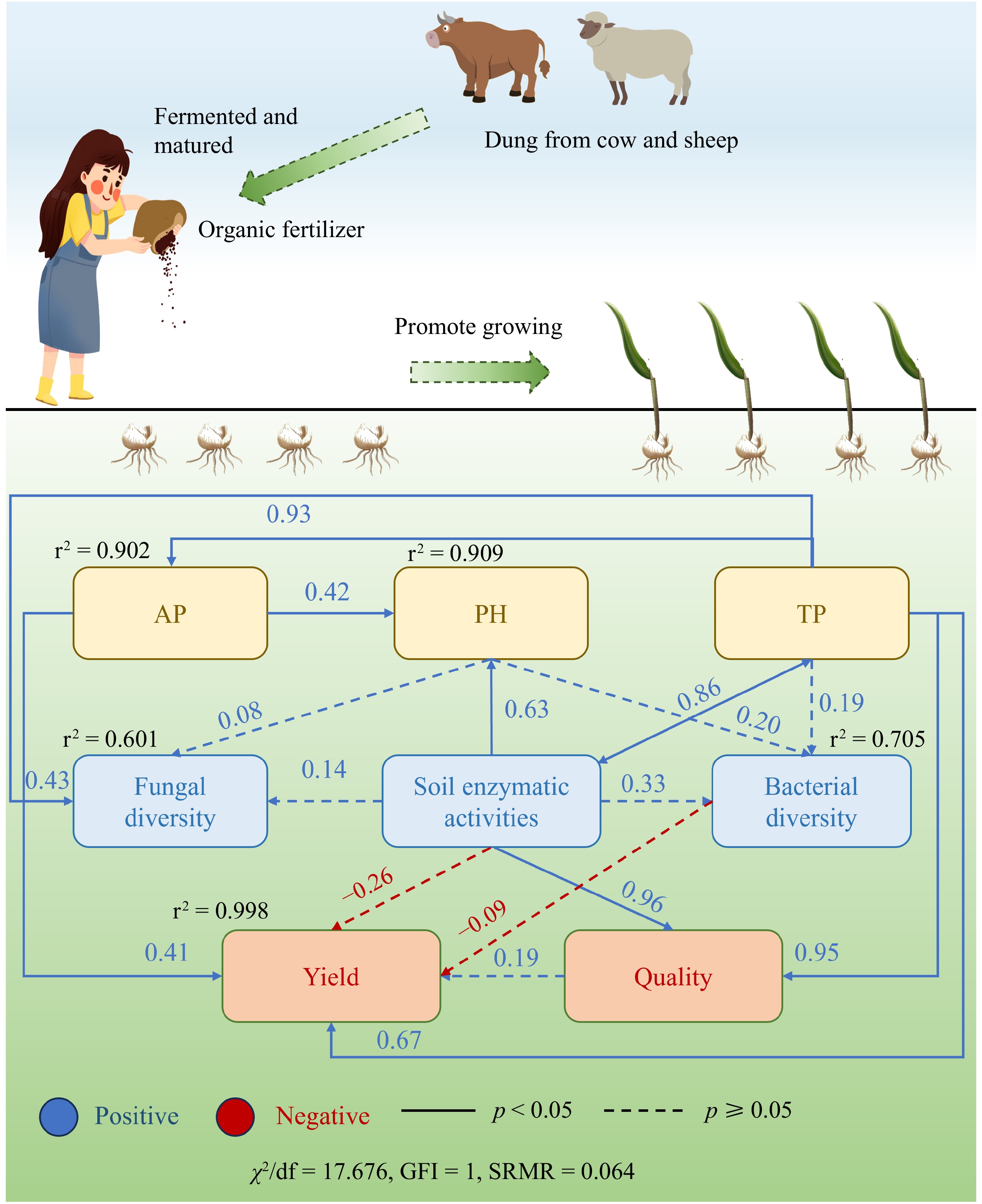 Structural equation modeling results describing the relationship among soil nutrients, microbial diversity, and F. unibracteata yield and quality. The relationship among soil pH value, total soil phosphorus content (TP), available phosphorus (AP), F. unibracteata production, and F. unibracteata quality with bacterial diversity, fungal diversity, and soil enzymatic activities. Blue lines: positive correlation; full line: p < 0.05; dotted line: p ≥ 0.05. The numbers above the arrows indicate correlation strength. r2 denotes explained variance score. χ2, Chi-square; df, degrees of freedom; SRMR, standardized root mean square residual.