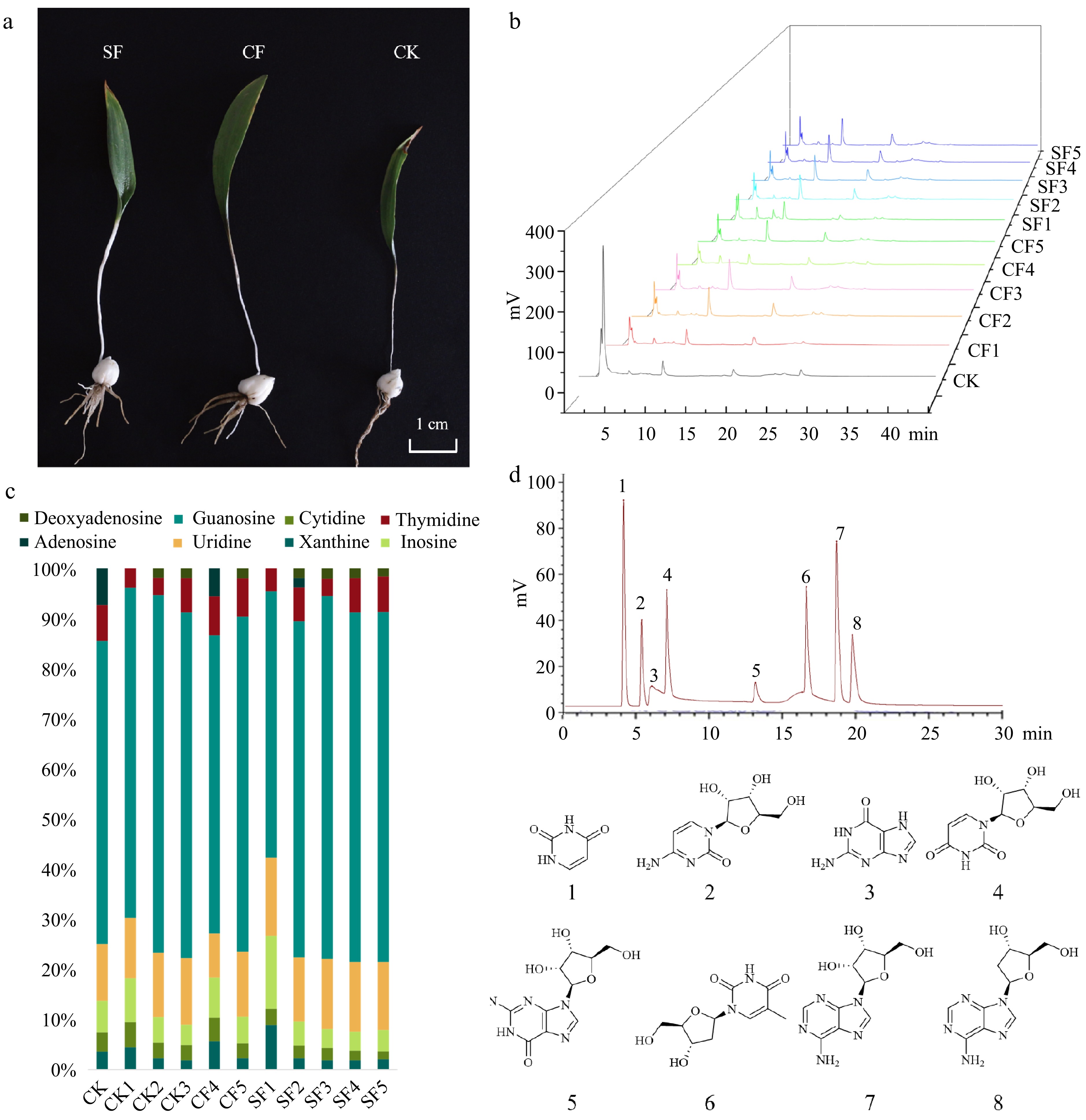 (a) Plot of F. unibracteata growth under each treatment. (b) HPLC fingerprints of F. unibracteata bulbs from different fertilization treatments. (c) Accumulation plot of nucleoside content of F. unibracteata under different fertilization treatments. (d) Fingerprints of nucleoside active ingredient standards. Peak identification: 1. xanthine; 2. cytidine; 3. inosine; 4. uridine; 5. guanosine; 6. thymidine; 7. adenosine; 8. deoxyadenosine.