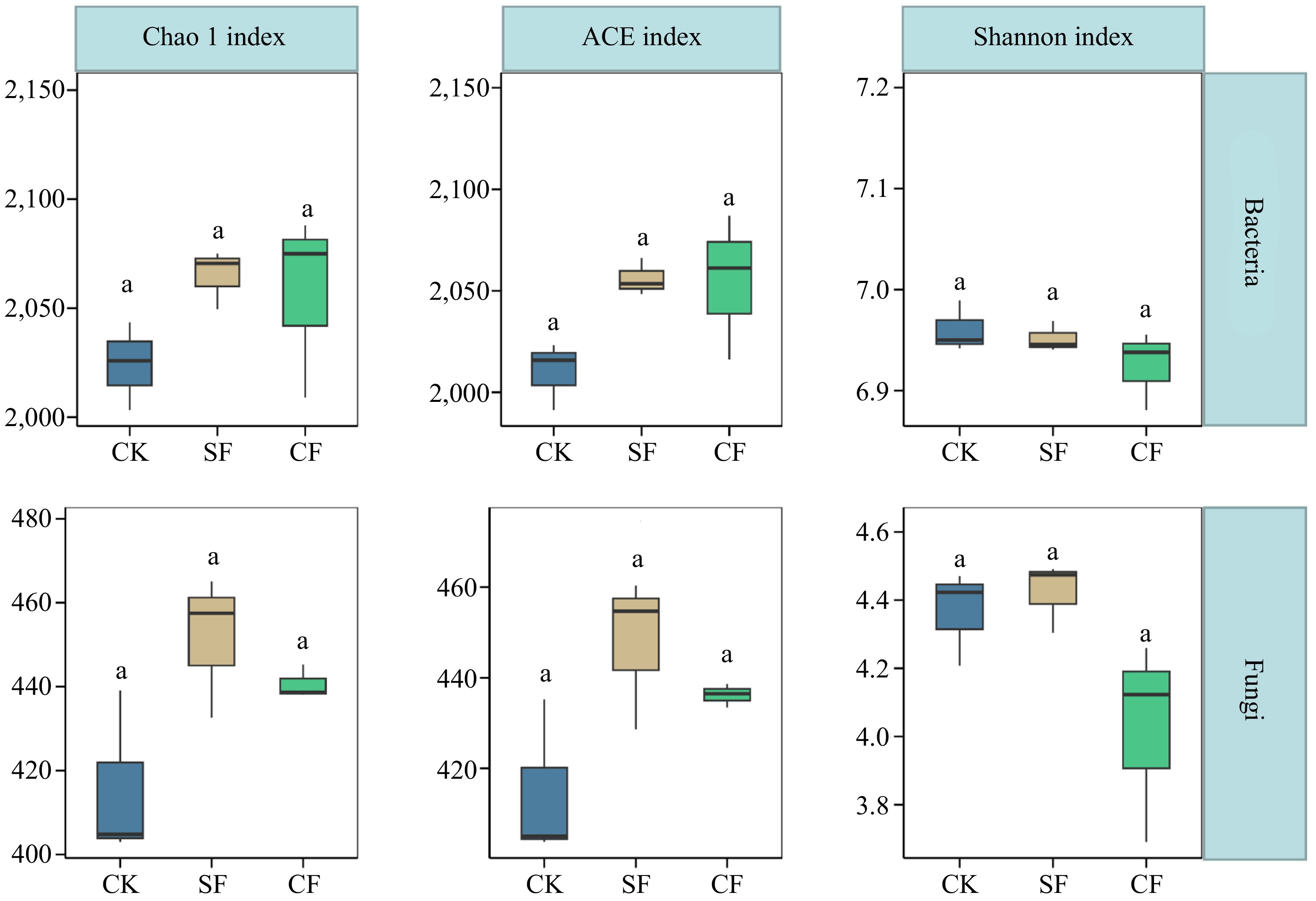 Effect of different treatments on Alpha diversity indices (ACE, Chao1, and Shannon) of soil bacterial and fungal communities. The letter 'a' indicates that there is no significant difference between the treatment groups (p < 0.05; multiple comparison with ANOVA tests). CK: no fertilizer treatment, CF: cow manure organic fertilizer treatment, SF: sheep manure organic fertilizer treatment.