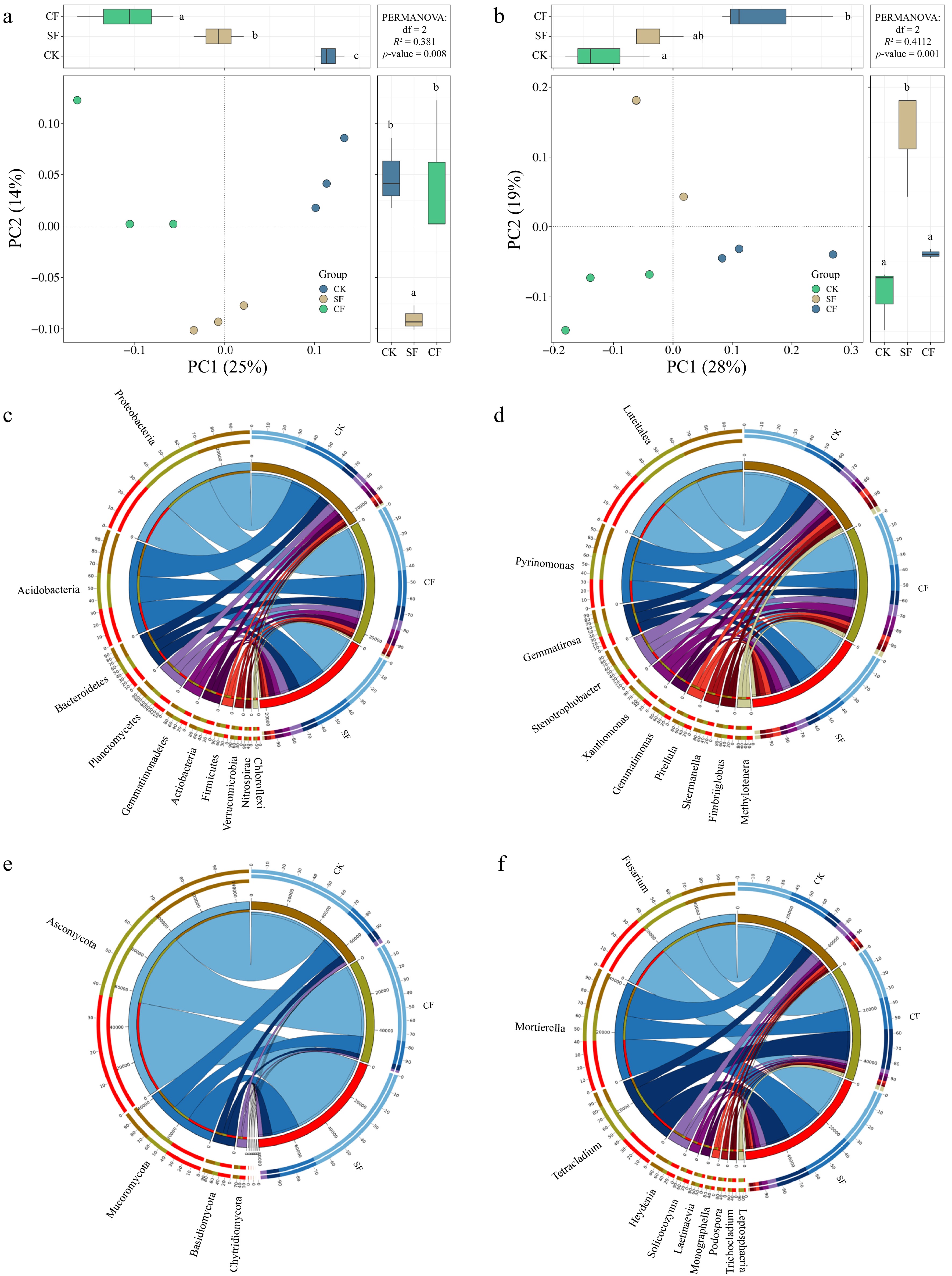 PCoA results of (a) bacterial, and (b) fungal communities found with different fertilization types. PCoA plot of first two principal components based on operational taxonomic units in F. unibracteata with different fertilization types. Letters a, b, c indicate significant differences between treatments (p < 0.05; multiple comparison with ANOVA tests). CK: no fertilizer treatment, CF: cow manure organic fertilizer treatment, SF: sheep manure organic fertilizer treatment. Composition of the soil microbial community under different fertilization regimes. (c) Composition of the bacterial community at the phylum level. (d) Composition of the fungal community at the phylum level. (e) Composition of the bacterial community at the genus level. (f) Composition of the fungal community at the genus level.