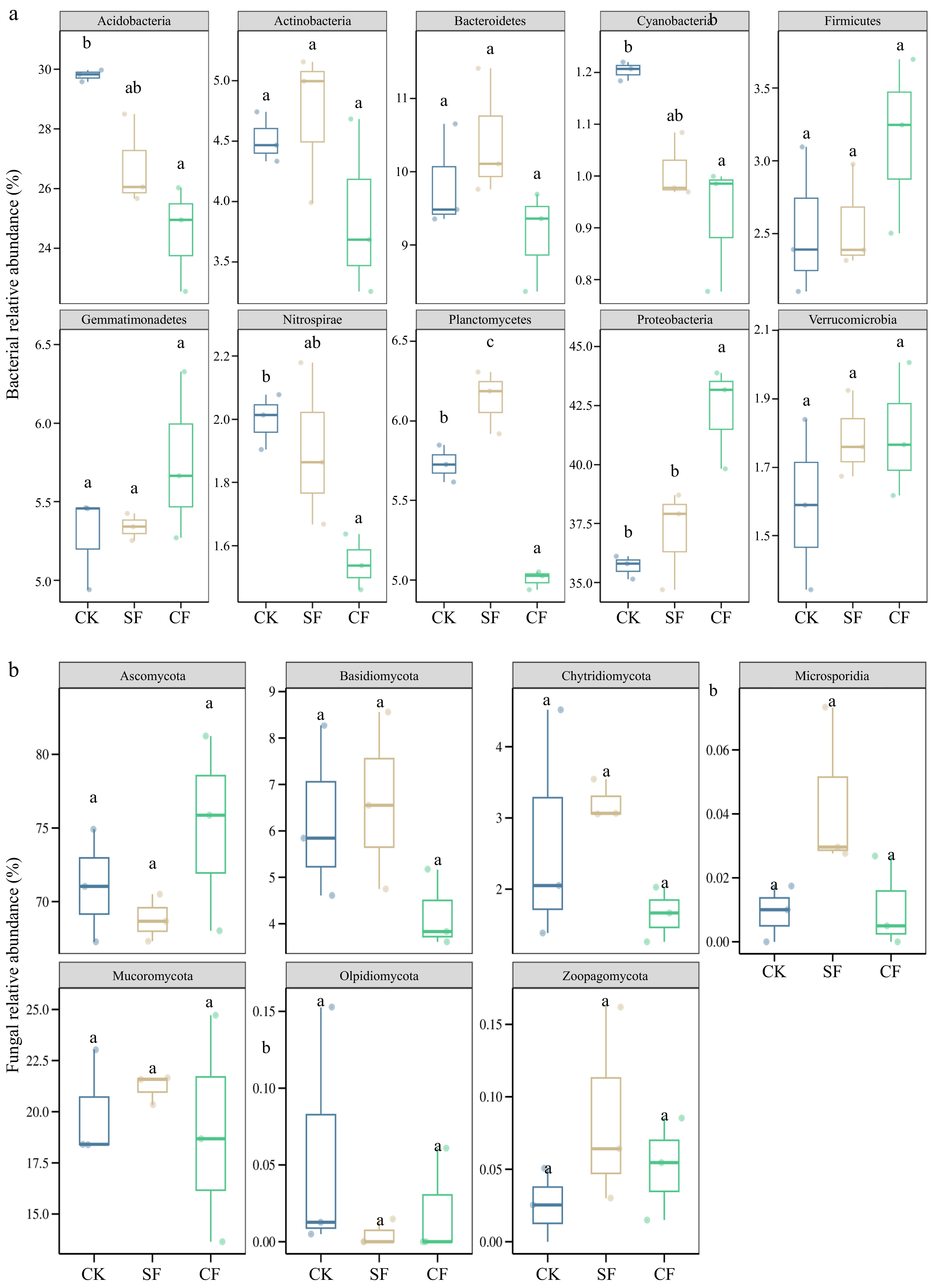 Sectional boxplots of group differences in the relative abundance of the top 10 species in soil samples from the comparative study of soil (a) bacterial and (b) fungal phyla levels under different fertilization treatments. Treatment groups with different lowercase letters indicate significant differences. Different letters (a, b, c) indicate significant differences among treatments (p < 0.05; multiple comparison with ANOVA tests). CK: no fertilizer treatment, CF: cow manure organic fertilizer treatment, SF: sheep manure organic fertilizer treatment.