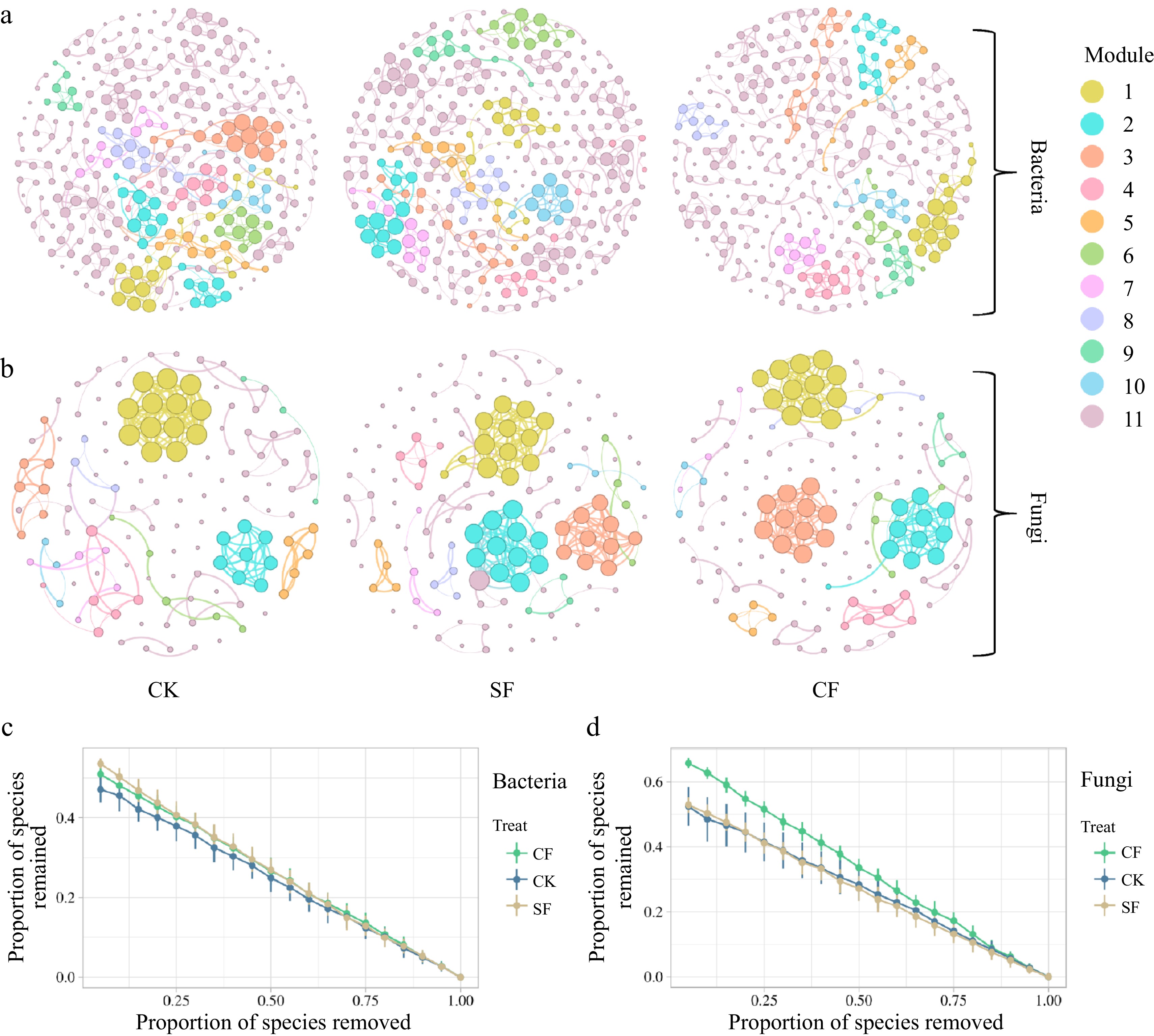 Co-occurrence networks of the soil microbial communities at the genus level in (a), (b) different fertilization treatment groups; and (c) the robustness of bacterial network, and (d) fungal network. The node size is proportional to the taxon abundance, and the nodes represent bacterial or fungi taxa at the genus level (genera with relative abundances greater than 0.10%). The node colors represent different bacterial and fungal phyla. CK: no fertilizer treatment, CF: cow manure organic fertilizer treatment, SF: sheep manure organic fertilizer treatment.