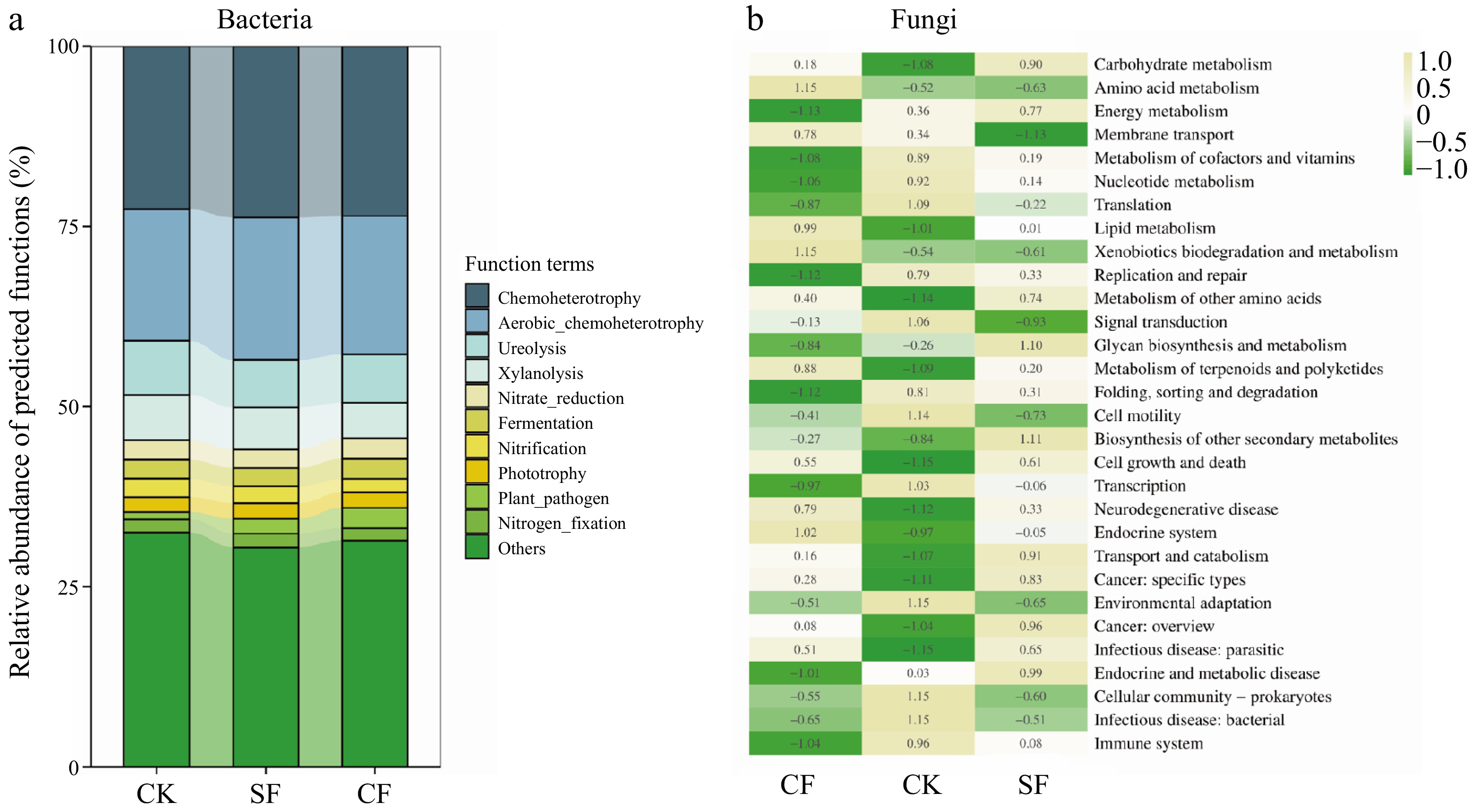 Analysis of soil microbial community function in different treatment groups. (a) Abundance barplot of FAPROTAX functional analysis of bacterial community and (b) the heat map of PICRUSt2 functional analysis of fungal community were performed. CK: no fertilizer treatment, CF: cow manure organic fertilizer treatment, SF: sheep manure organic fertilizer treatment.