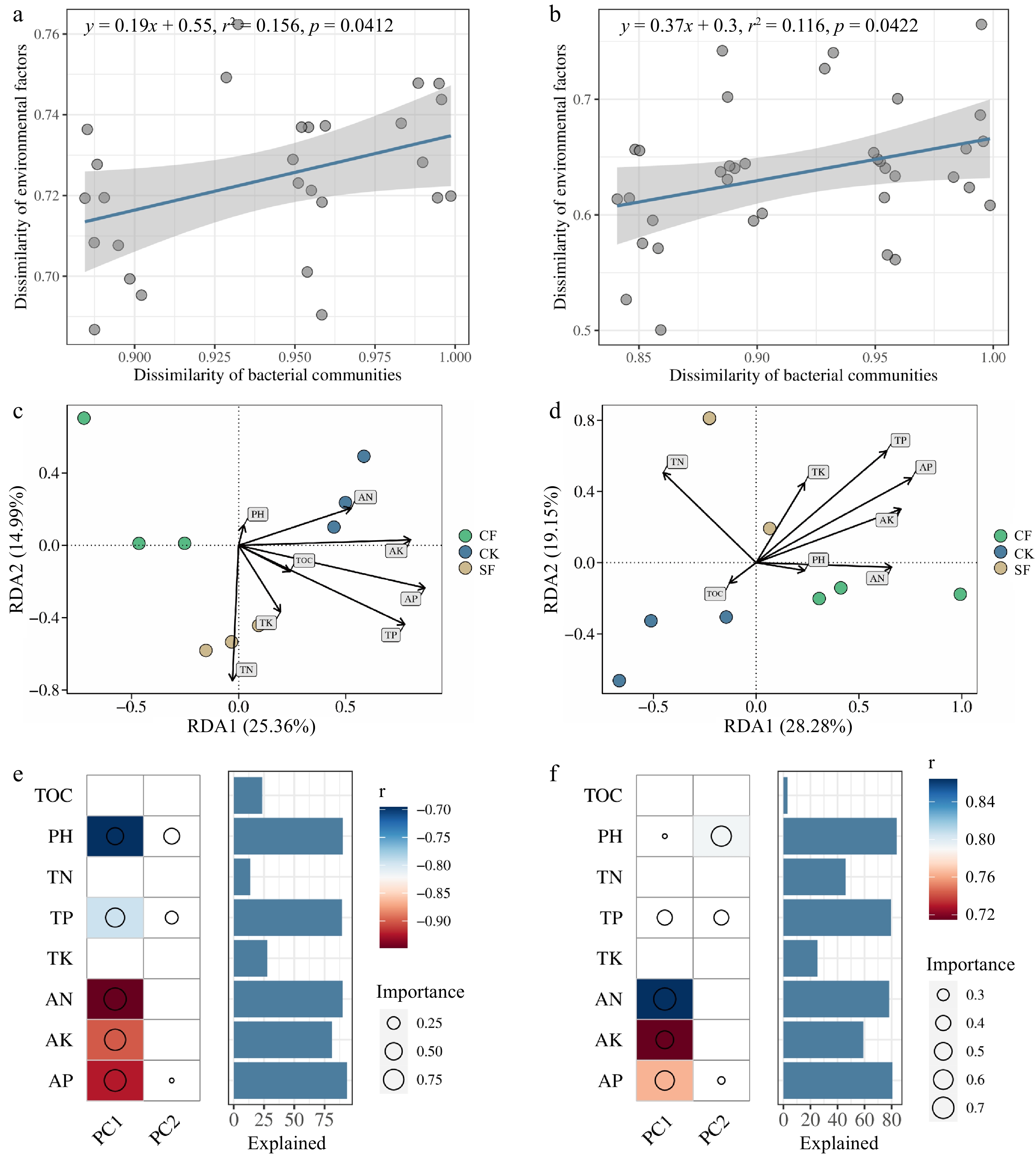 • Linear regression analyses revealed a positive correlation between the soil environmental factors and soil microorganisms (Fig. 8a & b). The RDA showed that the selected environmental factors accounted for 40.35% of the total variation in the bacterial community (Fig. 8c) and 47.43% of the total variation in the fungal community (Fig. 8d). The RDA plots identified pH (ANOVA, p = 0.027), AP (ANOVA, p = 0.017), and TP (ANOVA, p = 0.022) as the key environmental factors shaping the bacterial community composition, whereas pH (ANOVA, p = 0.002), TP (ANOVA, p = 0.009), and AN (ANOVA, p = 0.008) were identified as the primary drivers of fungal community composition. Random forest (RF) analysis confirmed that soil pH and TP, AP, AK, and AN contents were the predominant influencers of soil microbial community variation (Fig. 8e & f).