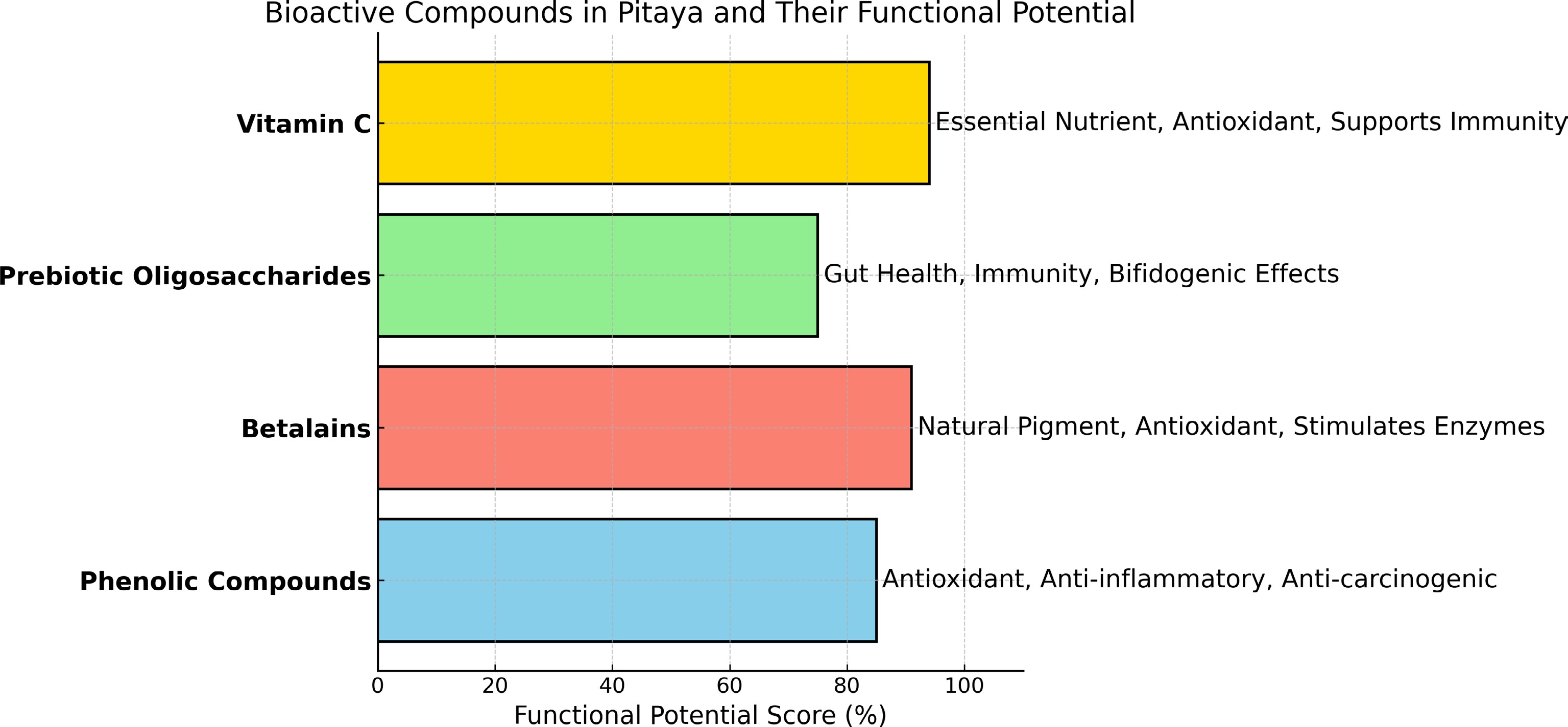 Horizontal bar chart illustrating the bioactive compounds present in pitaya and their functional potential, based on published literature. Each bar represents a specific compound: phenolic compounds, betalains, prebiotic oligosaccharides, and vitamin C, along with their associated health benefits, including antioxidant, anti-inflammatory, gut health enhancement, and immunity support. The functional potential score is represented as a percentage, providing a comparative view of the importance of each compound.