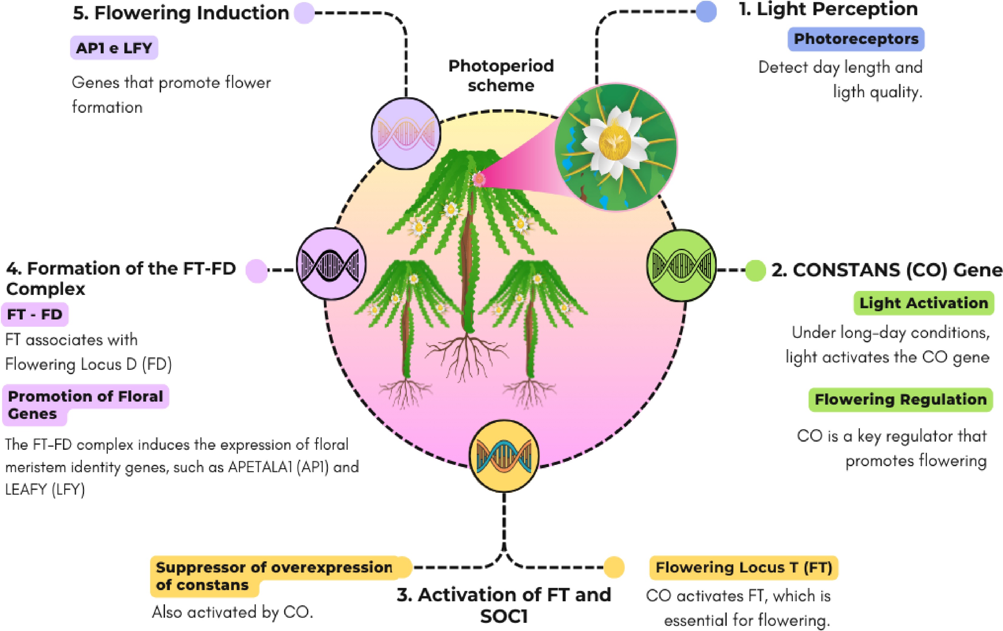 Flowering is governed by multiple biochemical and genetic pathways, such as those regulating photoperiod, vernalization, and gibberellic acid. Flower formation in plants encompasses three main stages: floral induction, floral evocation, and floral development[43]. These pathways respond to signals that regulate the timing of flowering, with the photoperiod pathway, in particular, responding to day length and light quality. Figure 2 illustrates a simplified model of the molecular mechanisms involved in this process. Under long-day conditions, the CONSTANS (CO) gene acts as a key regulator, activating FLOWERING LOCUS T (FT) and SUPPRESSOR OF OVEREXPRESSION OF CONSTANS 1 (SOC1). The FT protein subsequently forms a complex with FLOWERING LOCUS D (FD), which promotes the expression of floral meristem identity genes such as APETALA1 (AP1) and LEAFY (LFY), thereby inducing flowering[10].
