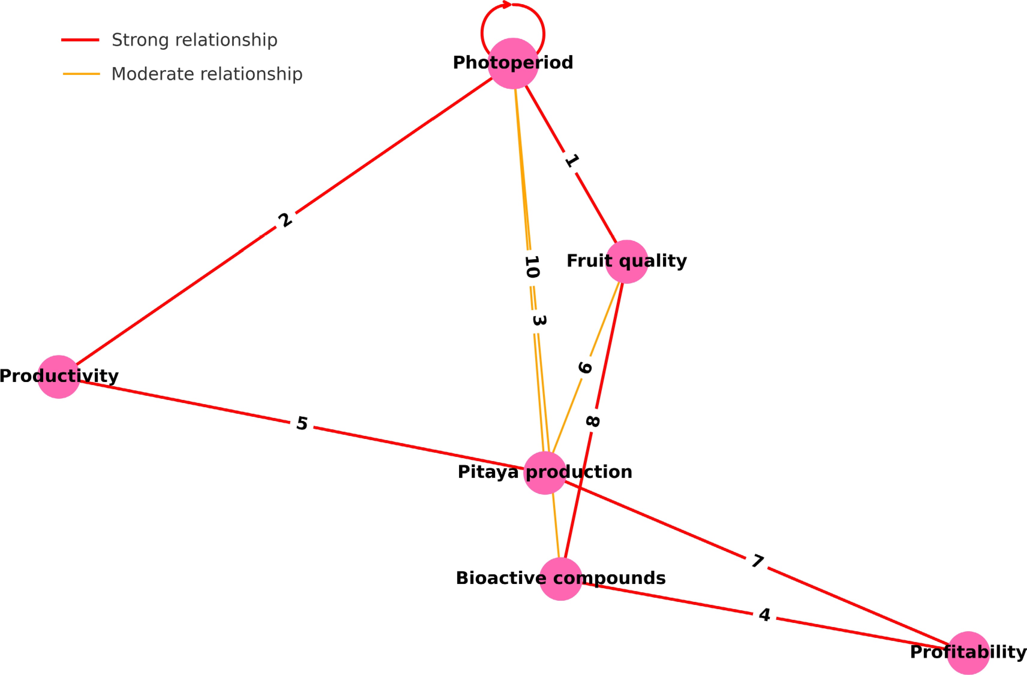 • To synthesize the key interactions associated with light supplementation in pitaya (Selenecereus spp.) cultivation, a conceptual network diagram was developed (Fig. 3). This diagram was constructed based on a critical review of the literature, drawing from studies published between 2008 and 2024 that addressed the physiological, biochemical, and agronomic responses of pitaya to controlled photoperiods and supplementary lighting. Variables were selected for their frequent citation in light-related studies and included photoperiod, fruit quality, productivity, bioactive compounds, pitaya production, and profitability.