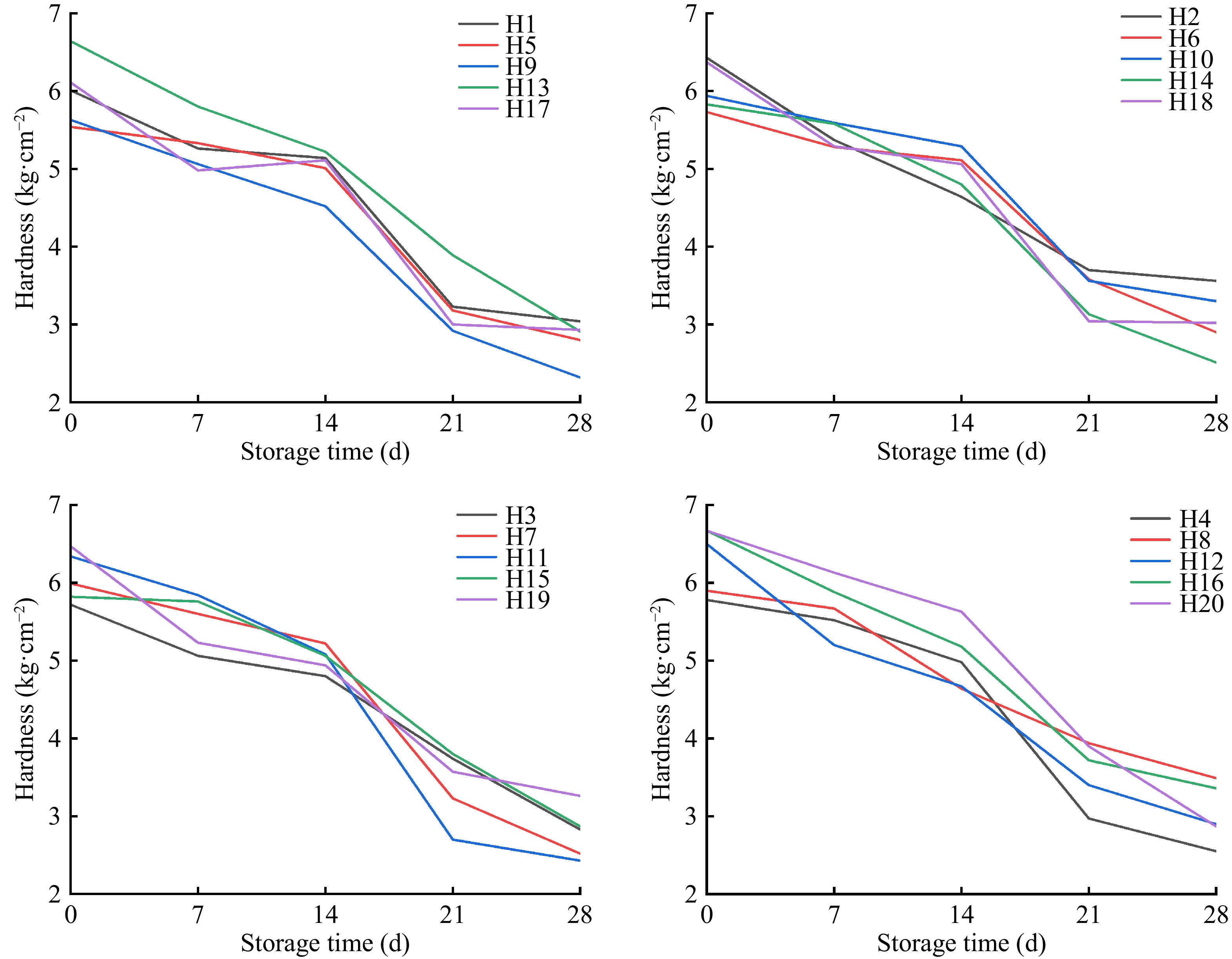 Based on the experimental data, the reaction rate constant k of the hard sand-cultured tomatoes, under the corresponding reaction coefficient was calculated from Eqns (3) and (4), and the correlation coefficient R2 was obtained. The results are shown in Table 2. The correlation coefficient R2 in the first-order reaction was larger than that in the zero-order reaction, which indicates that the fitting degree of the hardness change and the first-order reaction change was enhanced during the storage of sand-cultured tomatoes. Therefore, the kinetics of hardness change of sand-cultured tomato under storage was consistent with first-order reaction. In terms of hardness, the stored tomatoes in H2, H3, H12, H13, H15, and H20 groups fitted the first-order reaction kinetic model.