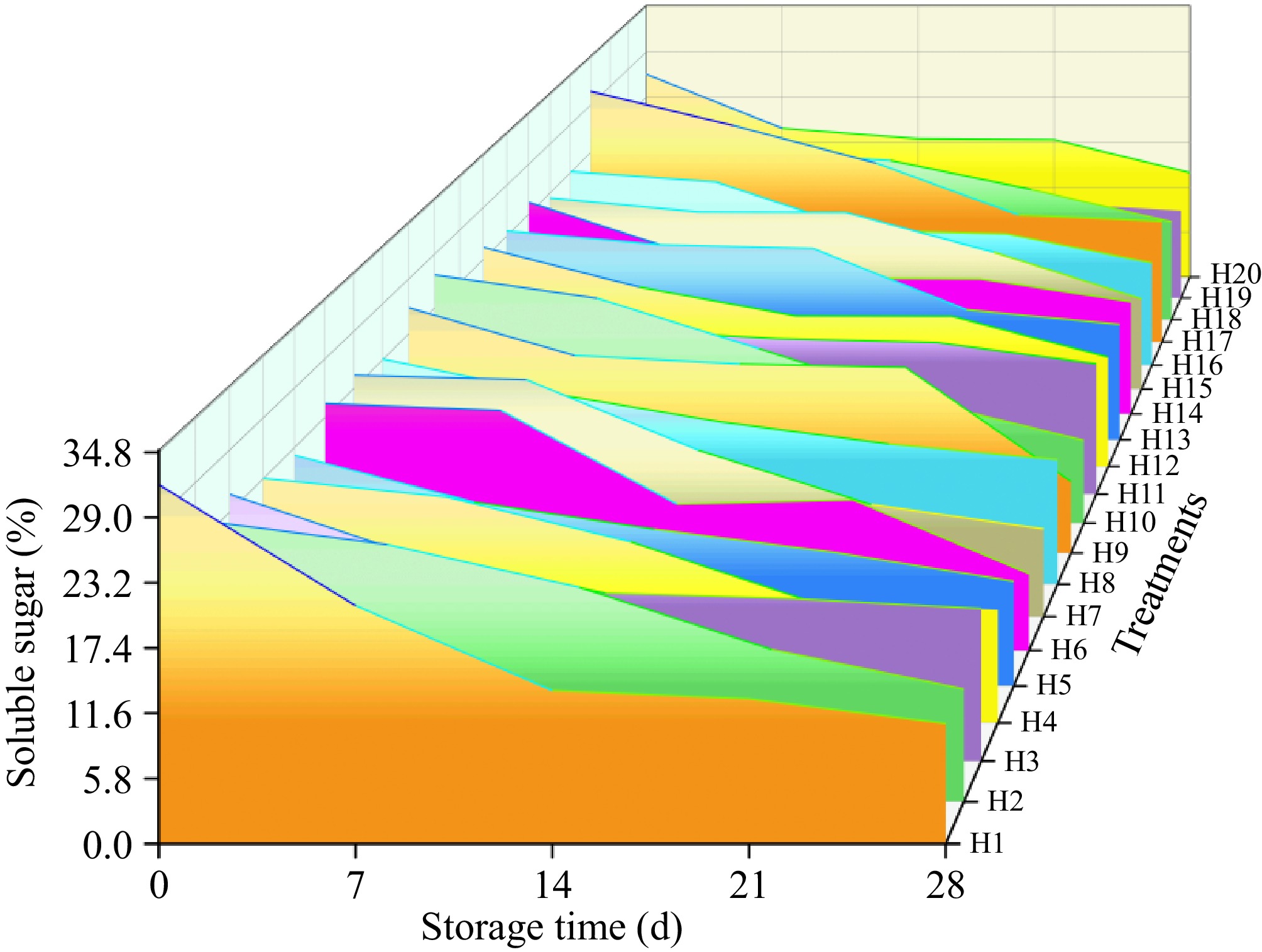 As shown in Fig. 2, different water and fertilizer ratios specifically altered the levels of soluble sugar in tomato during storage. With the extension of storage time, each treatment showed a uniform downward trend. Storage for zero to 14 d decreased the soluble sugar content under each treatment, with the largest decrease observed after storage for 14 d in H17 (2.19%), resulting in a decrease of 55.1%. The H13 group showed a soluble sugar value of 2.18%, representing a decrease of 25.8%. After 0−21 d of storage, H11 had the smallest decrease of 87.1%, and H1 had the largest decrease of 90.1%. At 28 d of storage, the soluble sugar value of H17 was the highest at 1.48%, followed by the H11 group, which was 1.43%. It indicated that the respiration rate consumed the soluble sugar content in tomato fruit during storage.