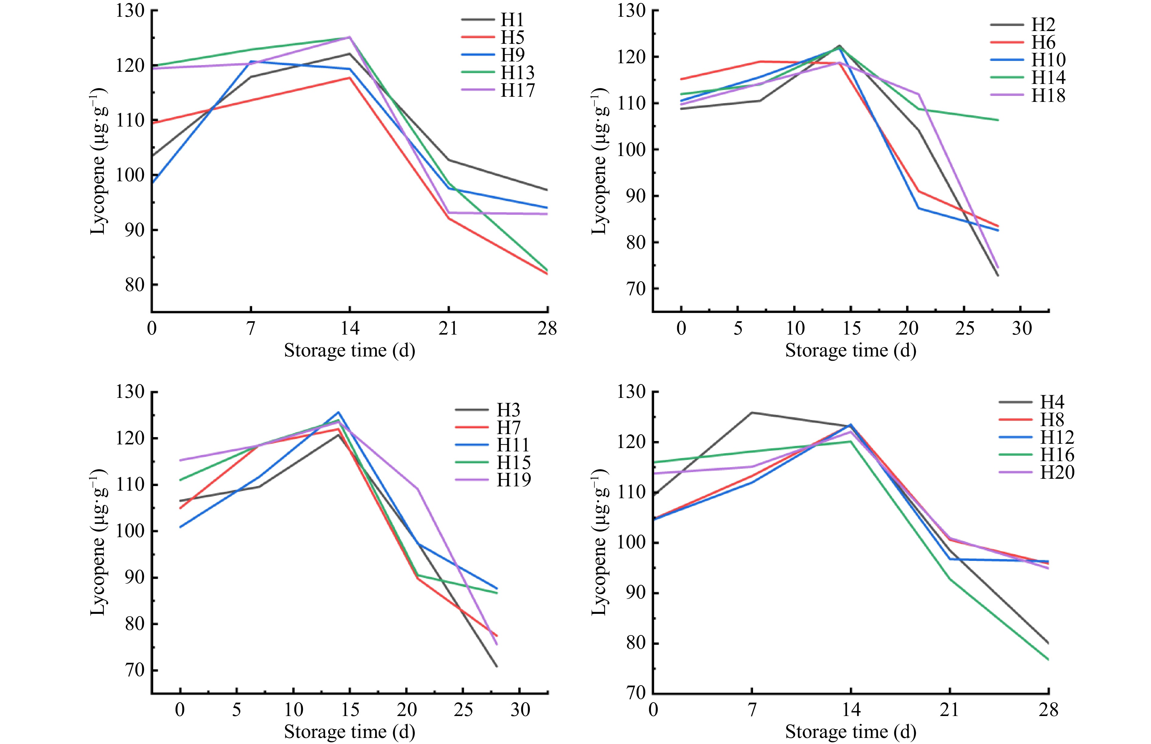 As shown in Fig. 3, different water and fertilizer ratios affected the changes in lycopene content during storage. With the prolongation of storage time, each treatment led to a 'slow rise-rapid decline'. The lycopene content of each treated fruit showed a slow upward trend at 0−14 d of storage. After 14 d of storage, the lycopene content of H11 increased the most, which was 125.62 μg·g−1, followed by H13, with a lycopene content of 125.02 μg·g−1. After 14−21 d of storage, the lycopene content of tomato fruits in each treatment decreased rapidly. The decrease in lycopene levels of H18 was the smallest (15.4%), and the decrease in H10 was the largest (87.7%). At 28 d of storage, the lycopene value of H1 was the highest at 97.21 μg·g−1, followed by the H13 group, which was 96.08 μg·g−1. The observed biphasic pattern of lycopene content was attributed to enhanced biosynthesis during tomato postharvest ripening, followed by degradation triggered by climacteric respiration during storage.