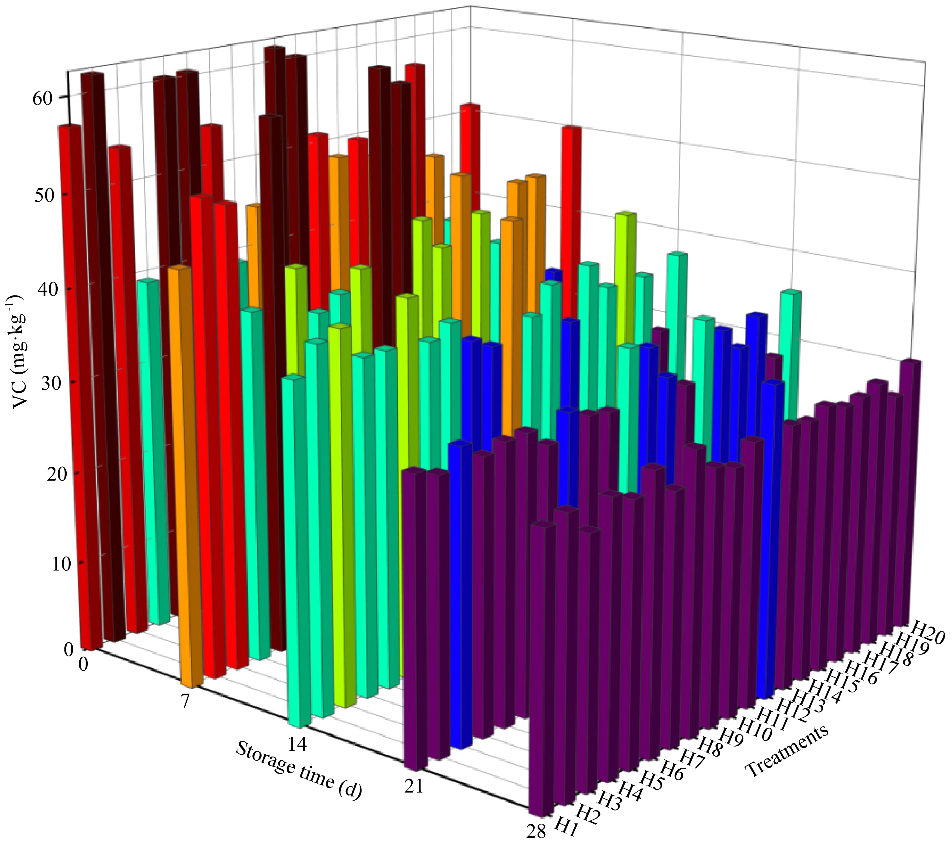 Vitamin C content is one of the important indexes to evaluate the comprehensive quality of tomato. As shown in Fig. 4, different water and fertilizer ratios specifically altered the vitamin C content during storage. With the extension of storage time, each treatment showed a 'fast-slow' downward trend. The vitamin C content of each treated fruit showed a rapid downward trend during zero to 14 d of storage. When stored for 14 d, the vitamin C content of H11 was the highest, which was 46.23 mg·kg−1, with a decrease of 43.9%, followed by H17, with a vitamin C content of 42.50 mg·kg−1, representing a decrease of 41.7%. After 14−28 d of storage, the vitamin C content of tomato fruits in each treatment decreased slowly, with the smallest decrease of 9.3% in H19 and the largest decrease of 46.6% in H17. After 28 d of storage, the vitamin C content of H12 was the highest, which was 30.68 mg·kg−1, followed by H13 group, which showed a vitamin C level of 29.85 mg·kg−1.