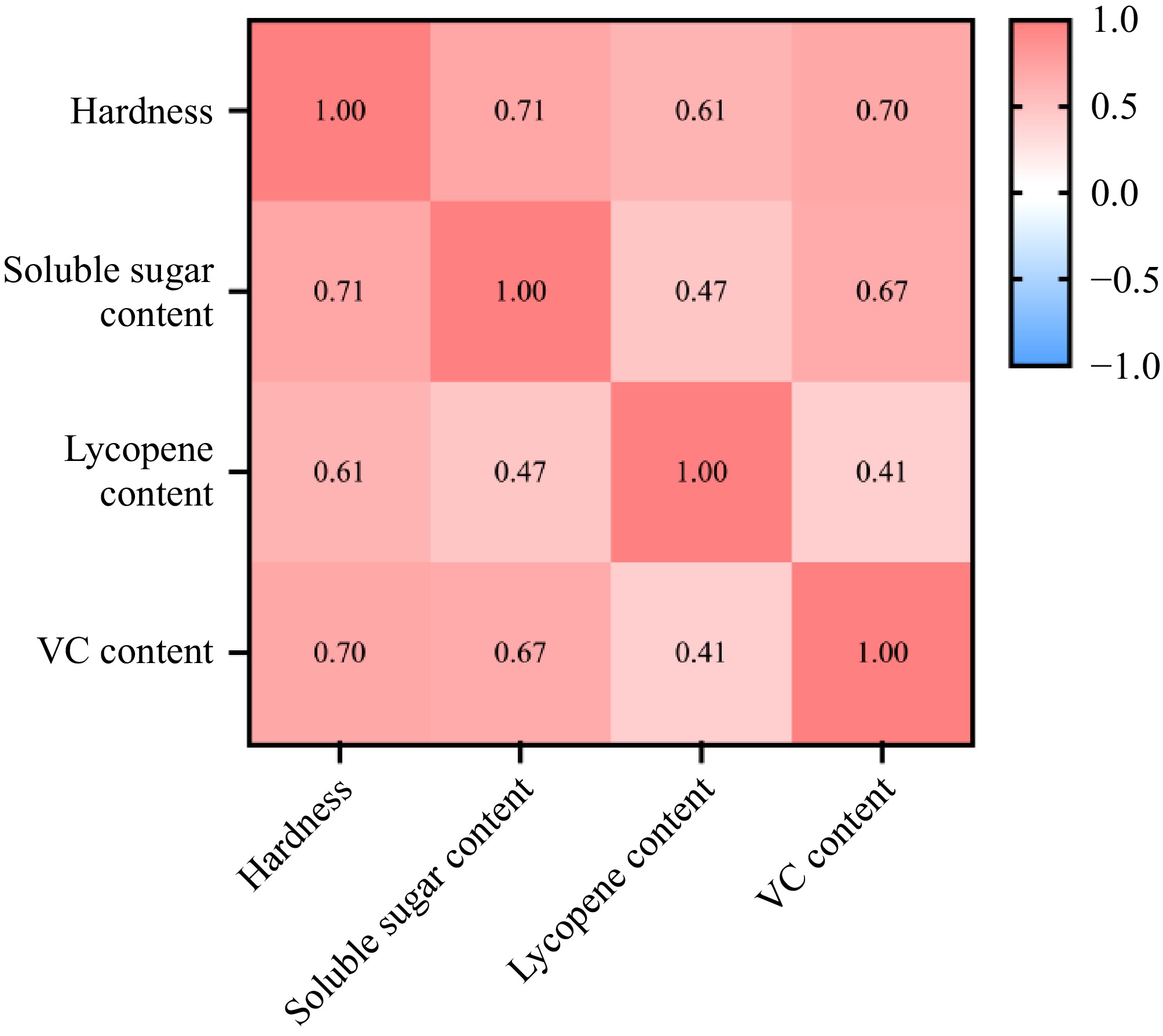 As shown in Fig. 5, hardness was significantly correlated with soluble sugar (R2 = 0.71, p < 0.01). The hardness was significantly correlated with lycopene content (R2 = 0.61, p < 0.01). Hardness was significantly correlated with vitamin C (R2 = 0.70, p < 0.01). Soluble sugar was significantly correlated with lycopene level (R2 = 0.47, p < 0.01). Soluble sugar was significantly correlated with vitamin C (R2 = 0.67, p < 0.01). A specific correlation existed between different indices.