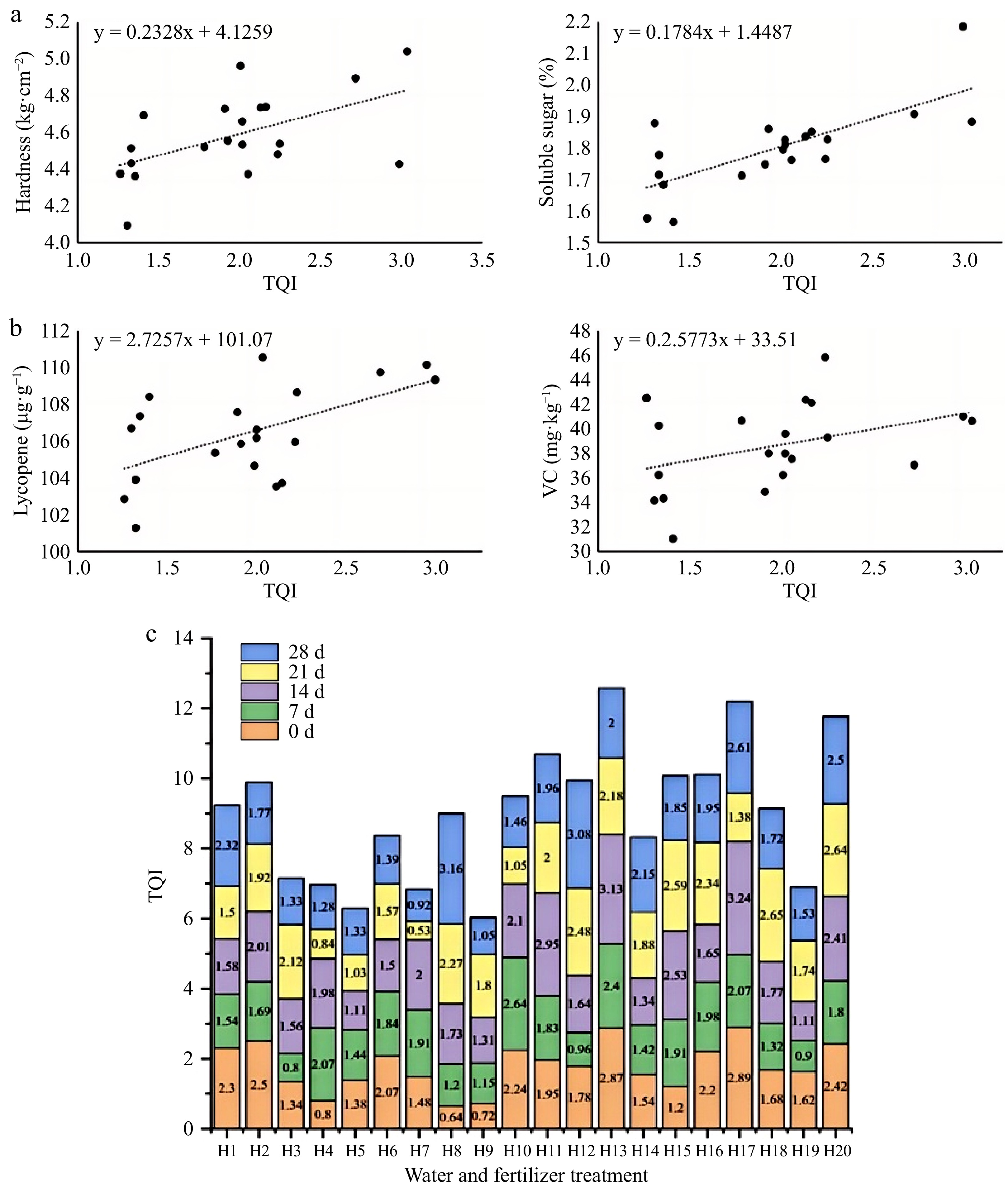 By integrating indicators related to tomato quality such as hardness, soluble sugar, lycopene, and VC, TQI can be used to comprehensively evaluate the quality of tomato fruit after storage under different water and fertilizer treatments. In this experiment, H13-treated tomatoes showed better comprehensive quality during extended storage.