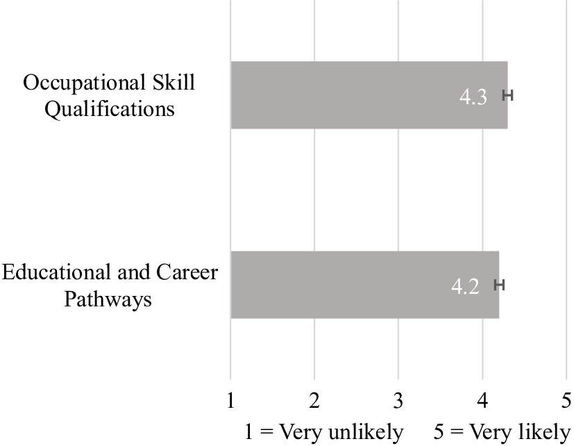 For the Educational and Career Pathways Framework, the mean likelihood rating was 4.2 (Fig. 1). The majority of respondents expressed positive adoption intent, with 41% selecting 'likely' and 39% selecting 'very likely'. Only 3% rated it as 'unlikely', and none selected 'very unlikely' (Fig. 2).