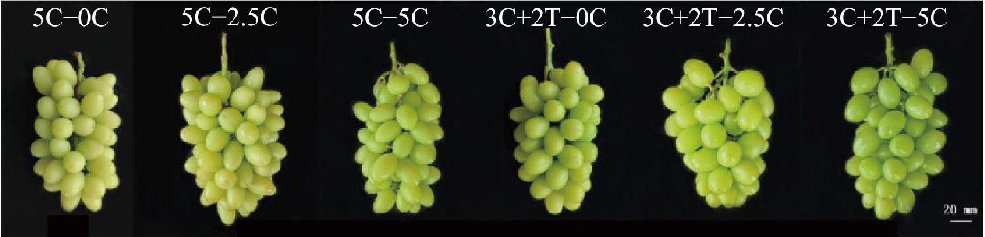 • All grape berries were harvested on the same day to ensure comparability. The longitudinal diameter of the berries was greatest under the 5C–5C treatment, while the transverse diameter reached its maximum under the 3C+2T–2.5C treatment. Due to a higher berry shape index, berries from the 5C–2.5C and 5C–5C treatments exhibited a long elliptical shape. The lowest berry weight was observed in the 5C–0C treatment, whereas the 3C+2T–5C treatment produced the heaviest berries. In addition, the 5C–5C treatment yielded the highest a* value and the lowest L* value, indicating a deeper green skin color (Fig. 1, Table 2).
