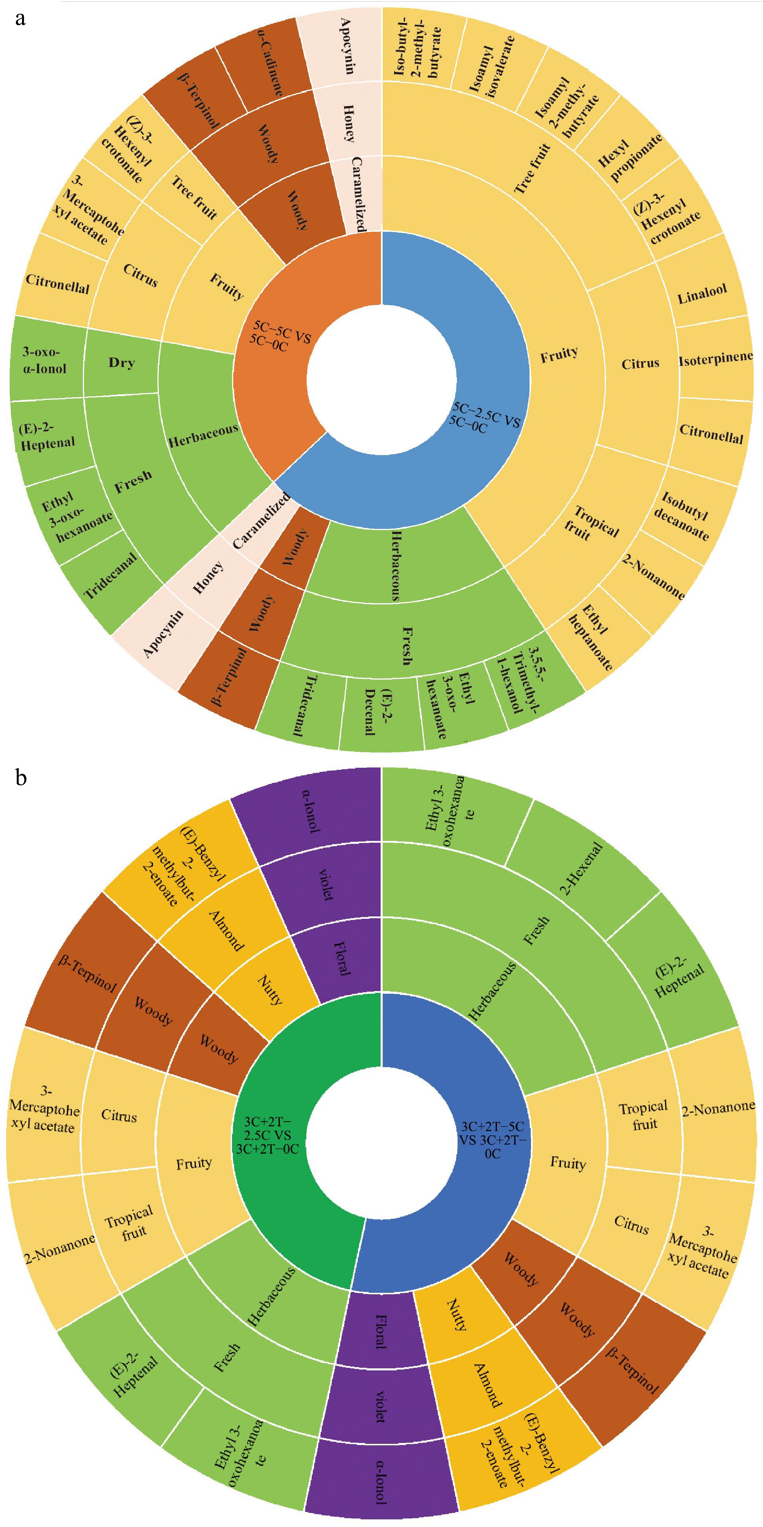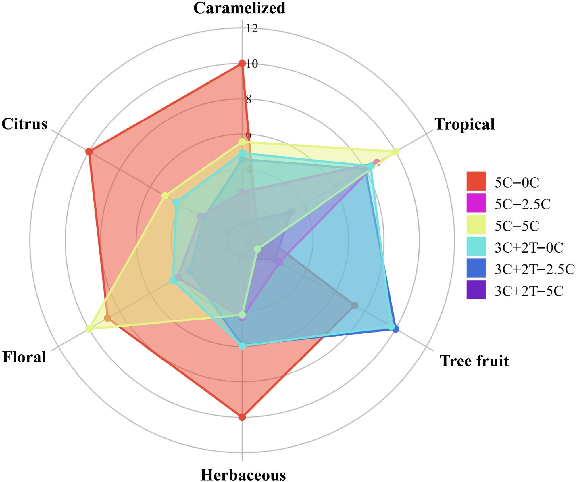 Aroma radar charts further revealed treatment-specific differences (Fig. 2). Grapes in the 5C–0C treatment exhibited the largest radar area, characterized by stronger herbaceous, citrus, and caramelized notes. In contrast, 5C–5C treatment enhanced tropical flavors but reduced herbaceous and tree fruit notes relative 5C–0C. The 3C+2T–0C and 3C+2T–2.5C treatments produced similar profiles with contributions from caramelized, herbaceous, tree fruit, and tropical notes. However, the 3C+2T–2.5C treatment lacked citrus flavor.