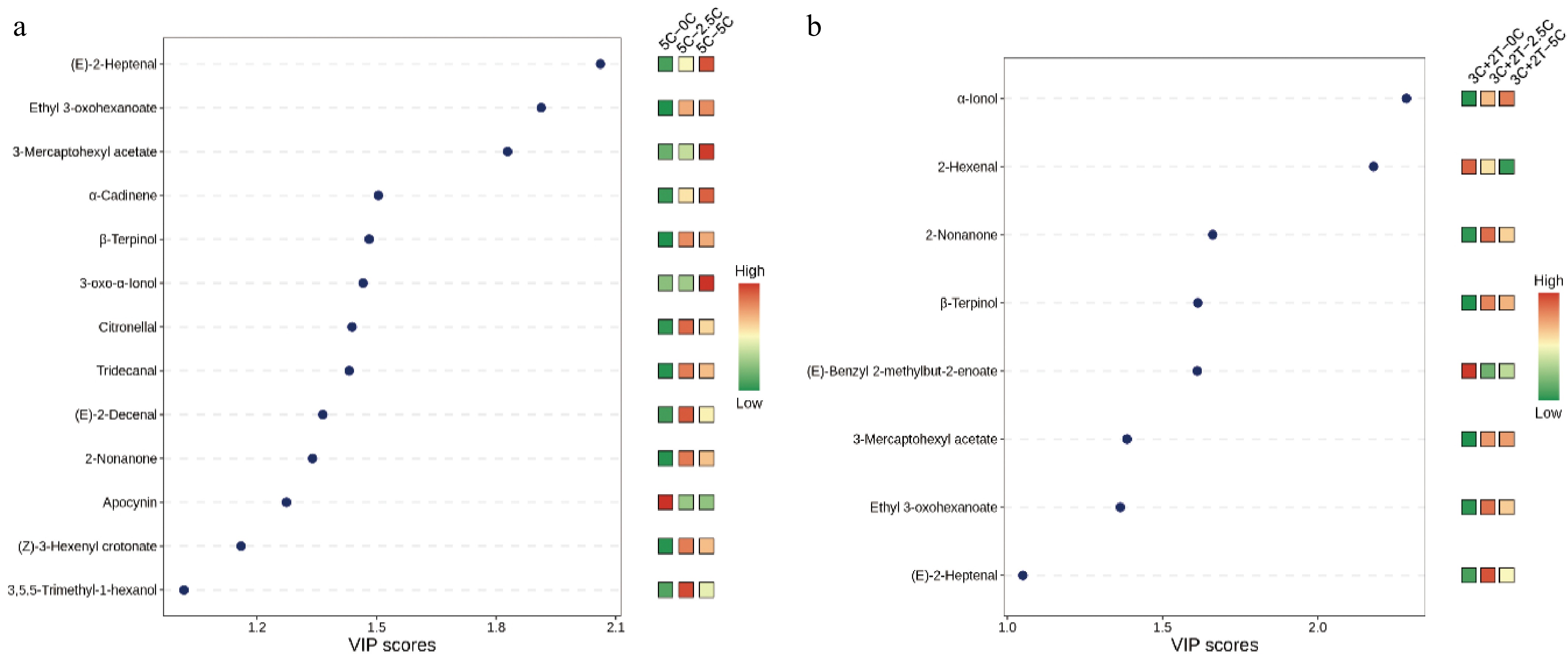 Differential metabolites identified by VIP and FC values. (a) FC values for 5C–0C vs 5C–2.5C, 5C–0C vs 5C–5C. (b) FC values for 3C+2T–0C vs 3C+2T–2.5C, 3C+2T vs 5C–5C.