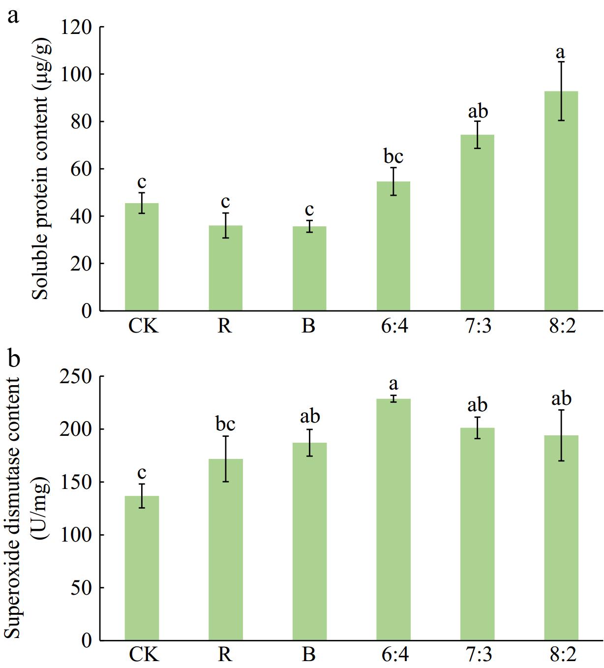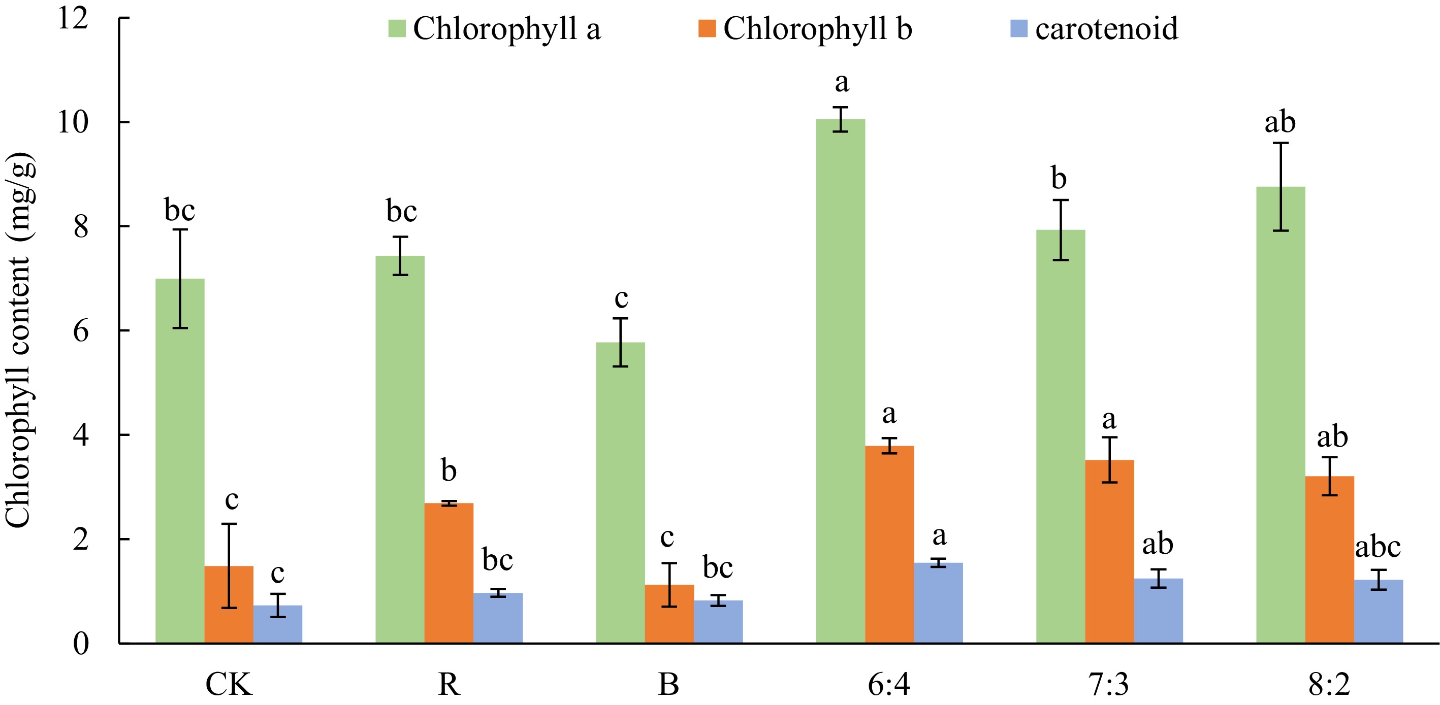 Different treatments Plant height (cm) No. of leaves (piece) Leaf length (cm) Leaf width (cm) No. of roots (strip) Root length (cm) Fresh weight (g) Dry weight (g) Ground Ground floor Ground Ground floor CK 9.78 ± 0.17 c 7.40 ± 0.68 b 4.62 ± 0.21 bc 2.02 ± 0.05 a 12.20 ± 0.97 b 7.34 ± 0.68 a 2.03 ± 0.08 b 0.51 ± 0.08 b 0.14 ± 0.014 b 0.06 ± 0.006 b R 10.41 ± 0.36 bc 9.00 ± 1.05 ab 4.24 ± 0.09 c 2.01 ± 0.09 a 14.20 ± 1.24 ab 9.57 ± 0.89 a 2.11 ± 0.12 b 0.58 ± 0.08 b 0.13 ± 0.004 b 0.05 ± 0.002 b B 10.44 ± 0.22 bc 9.40 ± 0.81 ab 4.62 ± 0.08 bc 2.18 ± 0.11 a 14.20 ± 1.28 ab 7.78 ± 0.33 a 2.26 ± 0.20 b 0.54 ± 0.04 b 0.15 ± 0.011 b 0.06 ± 0.006 b 6:4 11.94 ± 0.65 a 11.20 ± 1.68 a 5.20 ± 0.19 a 2.22 ± 0.04 a 14.40 ± 1.36 ab 7.91 ± 0.66 a 3.39 ± 0.15 a 0.55 ± 0.08 b 0.25 ± 0.019 a 0.06 ± 0.01 b 7:3 11.02 ± 0.93 ab 9.80 ± 0.86 ab 4.96 ± 0.23 ab 2.22 ± 0.02 a 16.20 ± 1.07 a 9.68 ± 1.11 a 2.27 ± 0.12 b 0.97 ± 0.08 ab 0.16 ± 0.011 b 0.08 ± 0.006 a 8:2 10.60 ± 0.30 bc 10.40 ± 0.87 ab 4.68 ± 0.22 abc 2.04 ± 0.08 a 15.40 ± 10.3 ab 9.16 ± 1.01 a 2.28 ± 0.21 b 1.20 ± 0.03 a 0.17 ± 0.015 b 0.09 ± 0.009 a Blue (B), Red (R), 60% Red + 40% Blue (6:4), 70% Red + 30% Blue (7:3), 80% Red + 20% Blue (8:2). The statistical analysis has been carried out separately for each cultivar. Different letters indicate significant differences using Duncan's multiple range test (p ≤ 0.05; n = 10). In terms of roots, the plants in the 7:3 treatment had the highest number of roots and the longest root length, with the number of roots significantly exceeding that of the plants in the CK group. For shoot biomass, the 6:4 treatment showed the maximum fresh weight, which was significantly higher than that in all other treatments. The maximum fresh weight for the underground plant parts was found in the 8:2 treatment group, followed by the 7:3 and 6:4 treatments. The maximum dry weight for the aboveground plant parts was found in the 6:4 treatment, and the dry weight of the underground part was highest in the 8:2 treatment. The second-highest dry weight of the underground part occurred in the 7:3 treatment, which was significantly higher than that in other treatments.