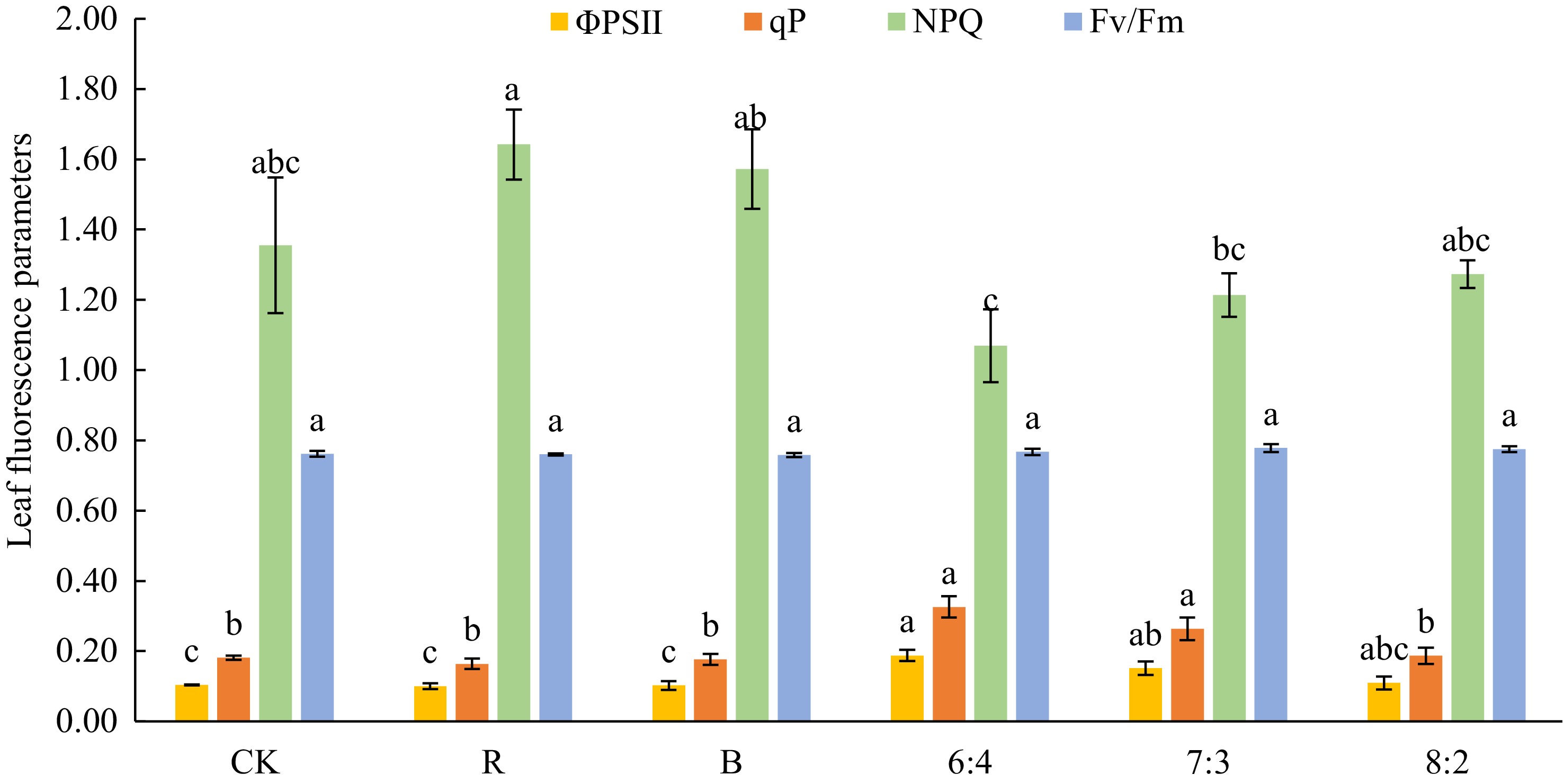 The fluorescence measurements of the leaves of Philodendron 'con-go' plants under different light quality treatments are shown in Fig. 2. The 6:4 treatment exhibited the highest actual photochemical efficiency (ΦPSII) and photochemical quenching coefficient (qP), which were 72.73% and 83.33% higher than those in the CK treatment, respectively. In contrast, the non-photochemical quenching coefficient (NPQ) was 21.33% lower than CK. However, the maximum photochemical efficiency (Fv/Fm) reached its peak value in the 7:3 treatment group. Plants under monochromatic light (B and R treatments) performed poorly in most photosynthetic parameters. The 6:4 and 7:3 treatments most significantly enhanced photosynthesis and were optimal for light quality optimization in hydroponic LED systems.
