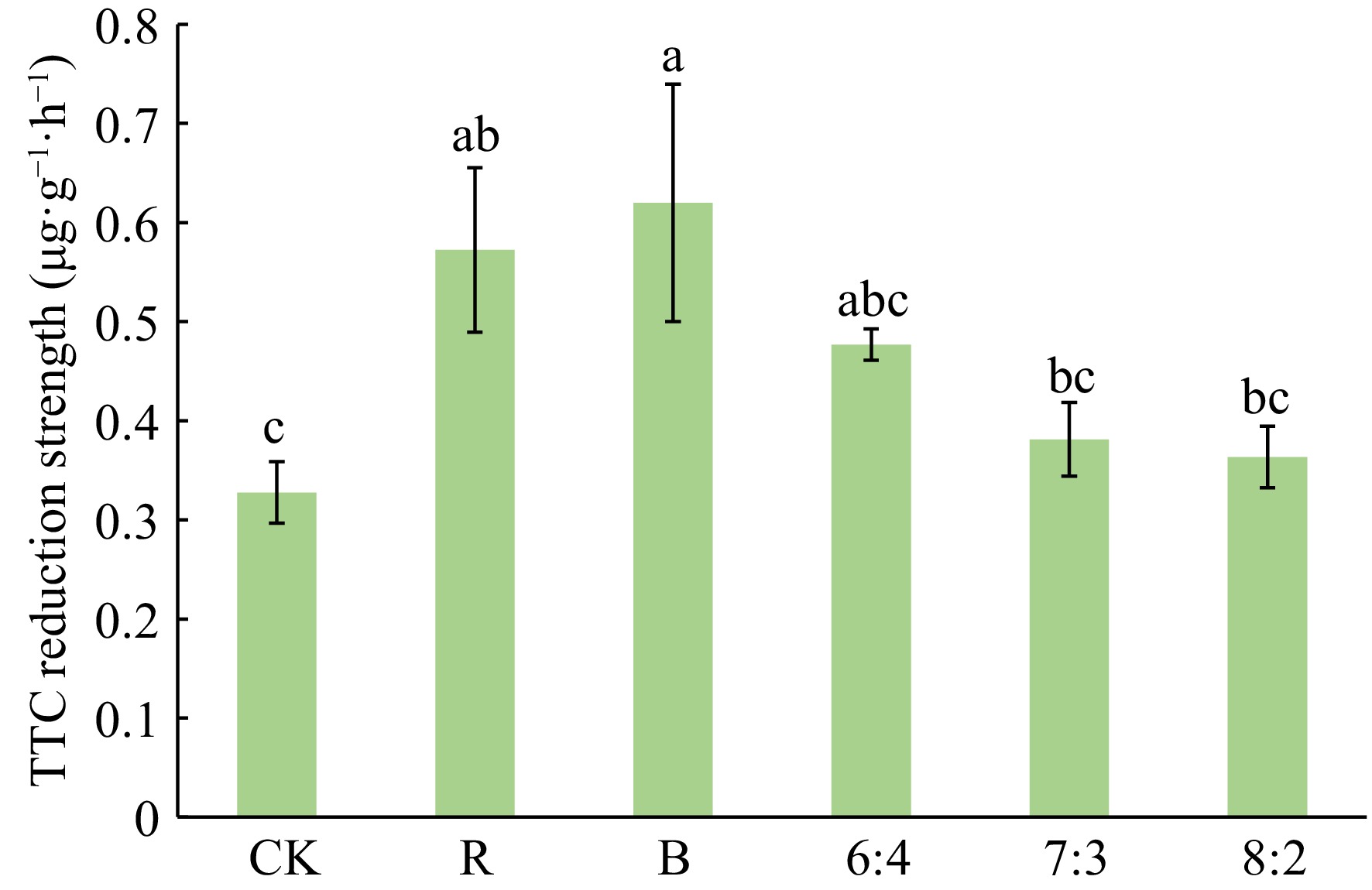 Root activity was determined using the triphenyltetrazolium chloride (TTC) reduction method of Ryssov-Nielson & Trevors[32,33]. The cleaned roots were immersed in TTC solution and phosphate buffer, and the reaction was terminated using 1 mol·L–1 sulfuric acid solution after incubation at 37 °C for 1 h. After elution with ethyl acetate, the absorbance at 485 nm was measured using a UV spectrophotometer. Root activity was calculated based on these results.