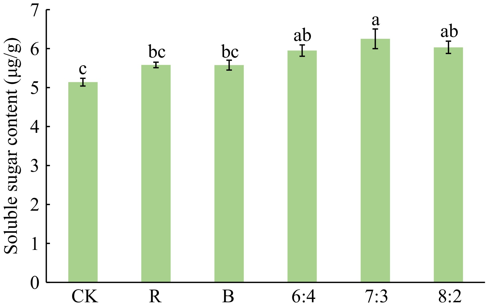 As shown in Fig. 4, the soluble sugar content of Philodendron 'con-go' showed significant differences under different light treatment conditions. Specifically, the plants in the 7:3 had the highest soluble sugar content, followed by the plants in the 8:2 and 6:4. The next highest soluble sugar contents were found in the plants in the R and B groups, and the plants in the CK had the lowest soluble sugar content.