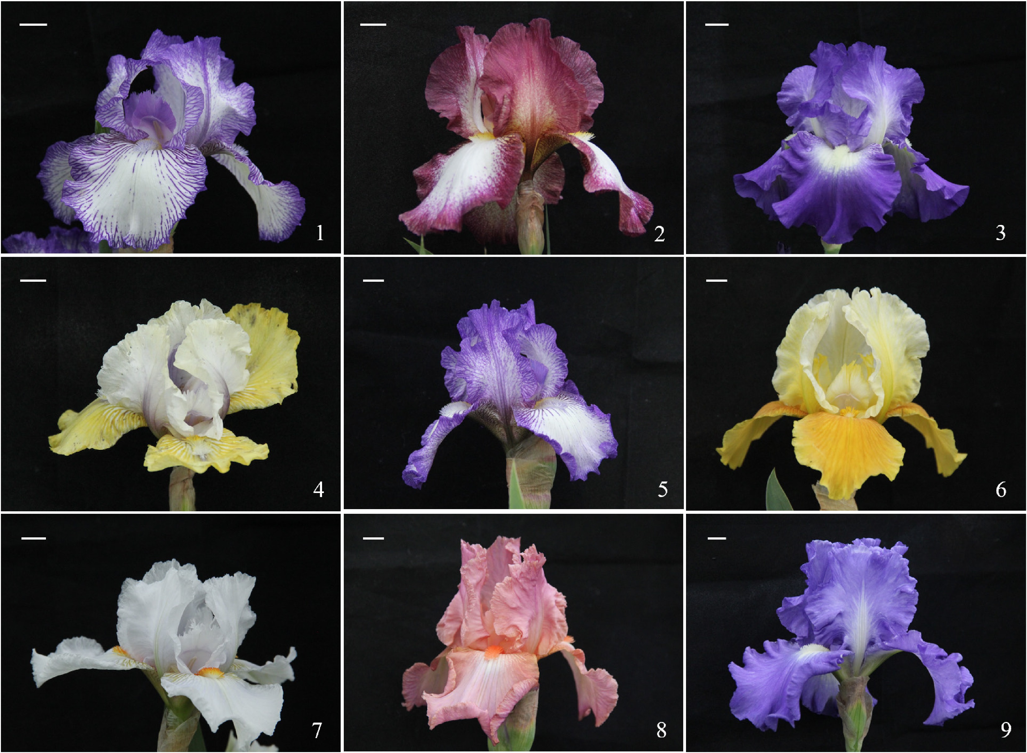 Bearded iris cultivars used in this study. Cultivar codes 1 to 17 correspond to the 17 bearded iris cultivars listed in Table 1. Bars = 1 cm.