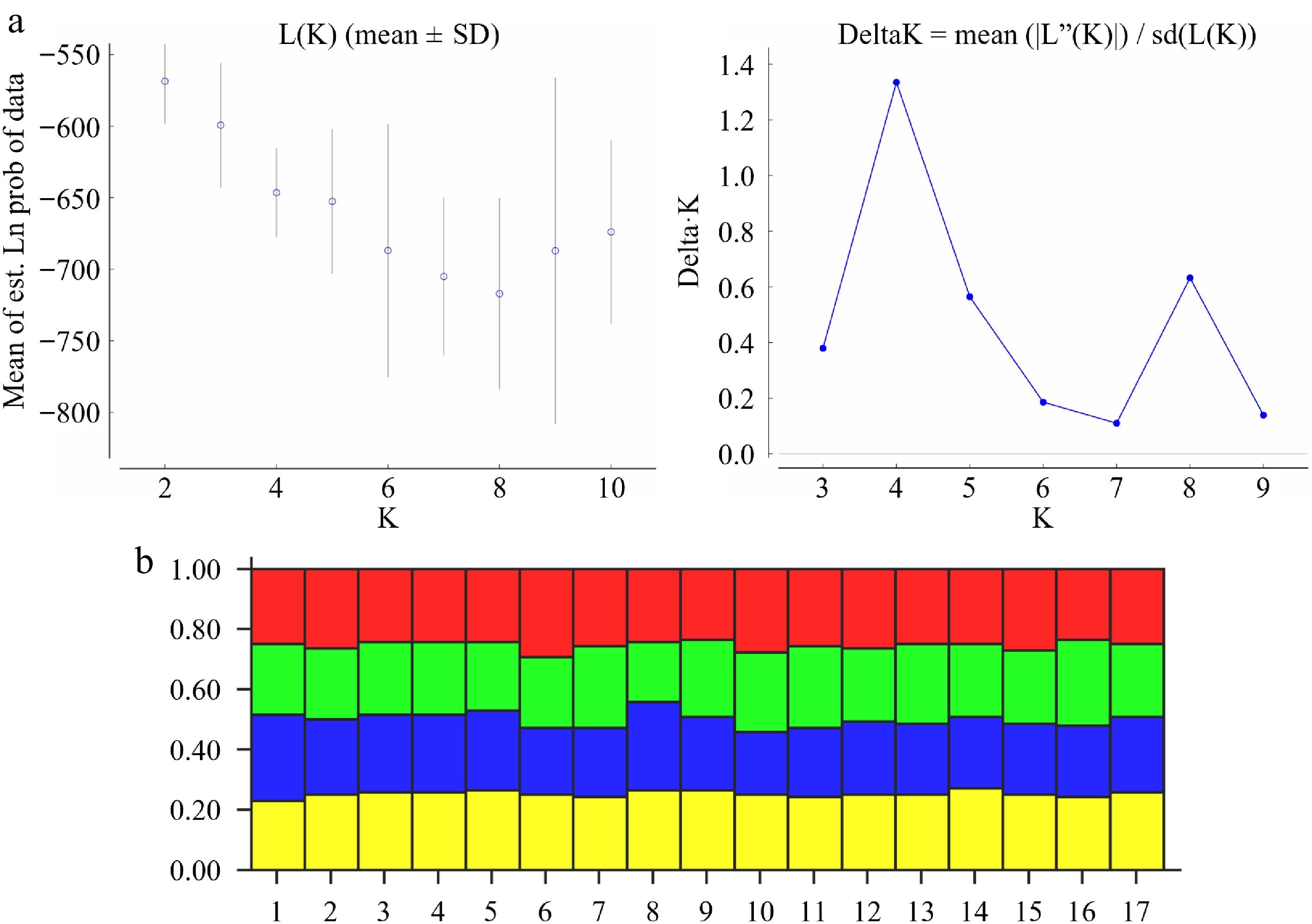 Population structure of 17 bearded iris cultivars. (a) Estimation of sub-population number. The left figure presents ln (data probability) vs K (2–10), and the right figure illustrates sub-population number against delta K. (b) Population structure analysis of 17 bearded iris cultivars. Cultivar codes 1 to 17 correspond to the 17 bearded iris cultivars listed in Table 1.