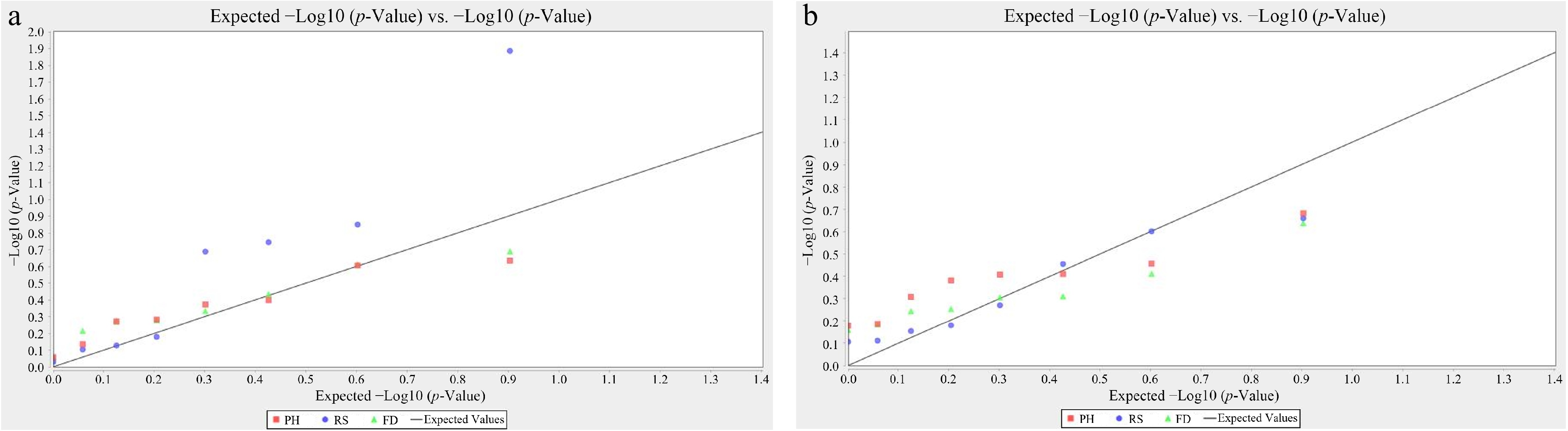 Quantile-quantile plot of the association analysis for the reblooming trait in bearded iris cultivars. (a) The generalized linear regression model (GLM). (b) The mixed linear model (MLM). RS, Reblooming Status; FD, Flower Diameter; PH, Plant Height.