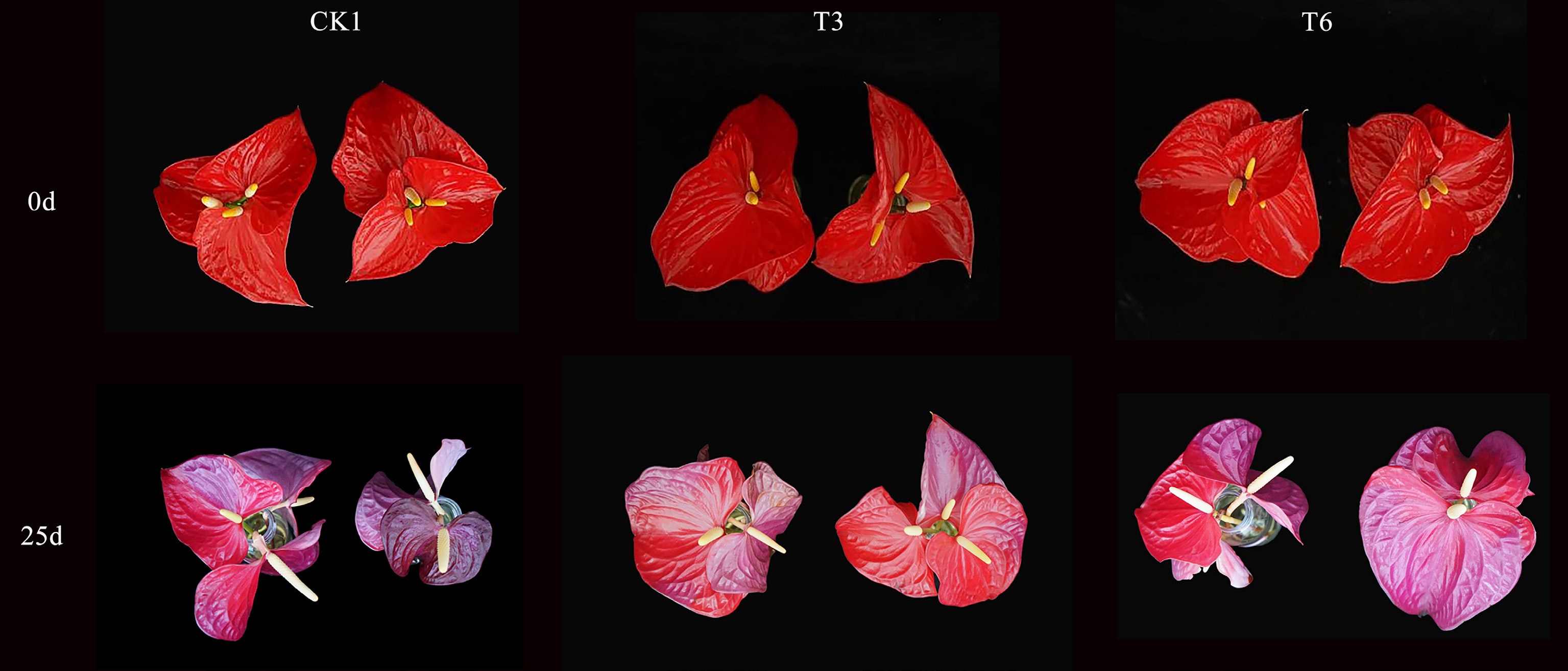 • Different concentrations of 6-BA and GA3 significantly affected the duration of vase life and the maintenance of ornamental traits of A.andraeanum cut flowers (p < 0.05) (Table 2). The T3 was the most effective, extending vase life to 25.33 d, which was 14.3% (3.16 d) and 9.3% (2.16 d) longer than the CK1 and CK2 control groups, respectively. Similarly, T6 resulted in a vase life of 24.83 d, representing increases of 12.0% (2.66 d) and 7.2% (1.66 d) over CK1 and CK2. In contrast, low concentrations of GA3 (50–100 mg·L−1) significantly reduced vase life to 18.33–18.50 d, indicating a concentration-dependent effect of GA3 on senescence. Morphological observations revealed that even on Day 25, cut flowers in T3 and T6 retained acceptable ornamental quality and were markedly superior to the control groups, which showed clear signs of senescence (Fig. 1). The treated flowers exhibited relative maintenance of spathe size and color, and spadix integrity compared to the severely degraded controls. Collectively, the results indicate that 6-BA at 30 mg·L−1 effectively delays postharvest senescence and prolongs the period of acceptable visual quality, while GA3 exerts a positive effect only at higher concentrations (150 mg·L−1).