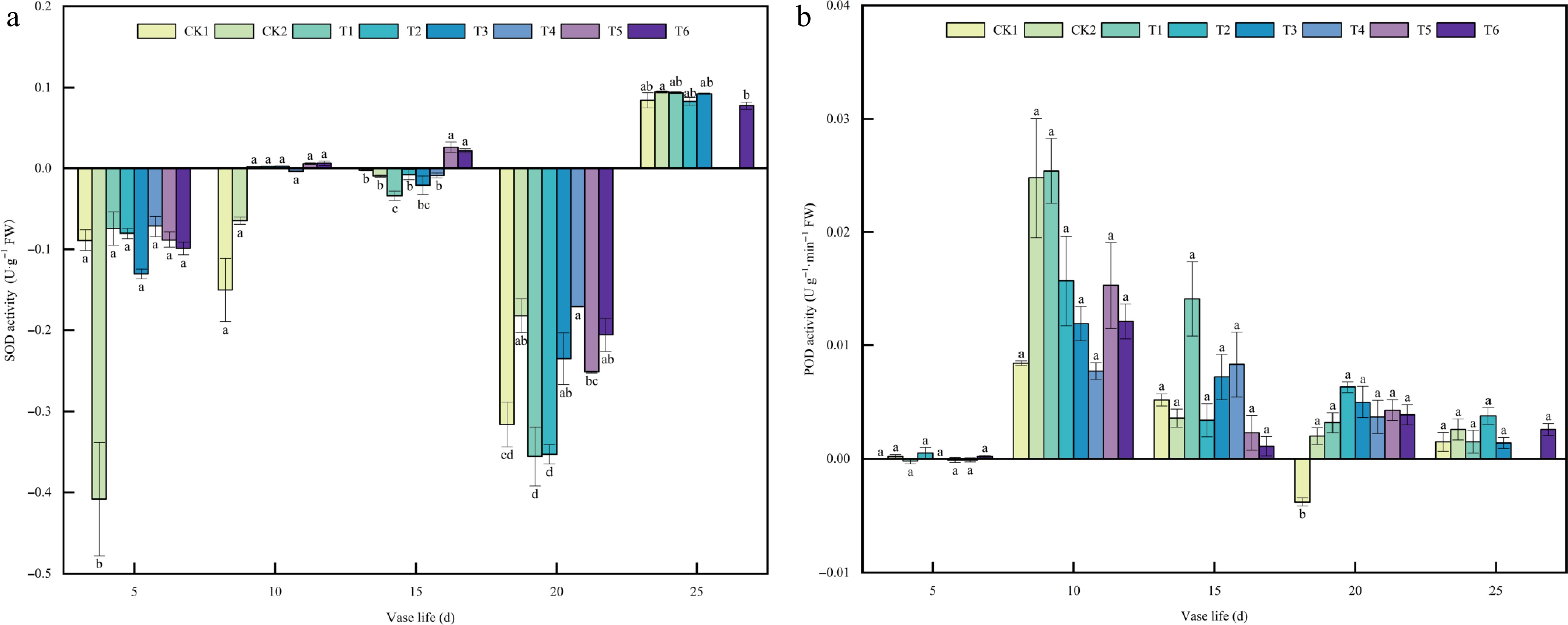 Variation trends of SOD and POD Activities are shown in Fig. 3a, b. During the early stage (Day 5), SOD and POD activities remained low across all treatments, with CK2 exhibiting significantly lower SOD activity, while POD activity showed no significant difference among treatments. By Day 10, both enzymes exhibited slight increases. SOD activity increased modestly in most hormone-treated groups, whereas POD activity rose more noticeably, with T1 reaching the highest level. At day 15, SOD activity peaked in T5 and T6, both being significantly higher than in the controls and other treatments, whereas POD activity declined overall without significant variation among treatments. By Day 20, both enzyme activities decreased, with SOD having the largest reduction in T3, while CK2 and T4 maintained relatively higher levels; POD activity also declined slightly, but T2 and T3 retained comparatively higher values. Toward the end of the vase period (Day 25), partial recovery of SOD activity was observed in several treatments, while POD activity remained low across groups. Overall, SOD activity displayed a rise-and-fall pattern with a distinct mid-term peak in T5 and T6, whereas POD activity had an early transient increase followed by a gradual decline, with CK2 peaking earlier and T3 maintaining moderate activity during the mid stage.