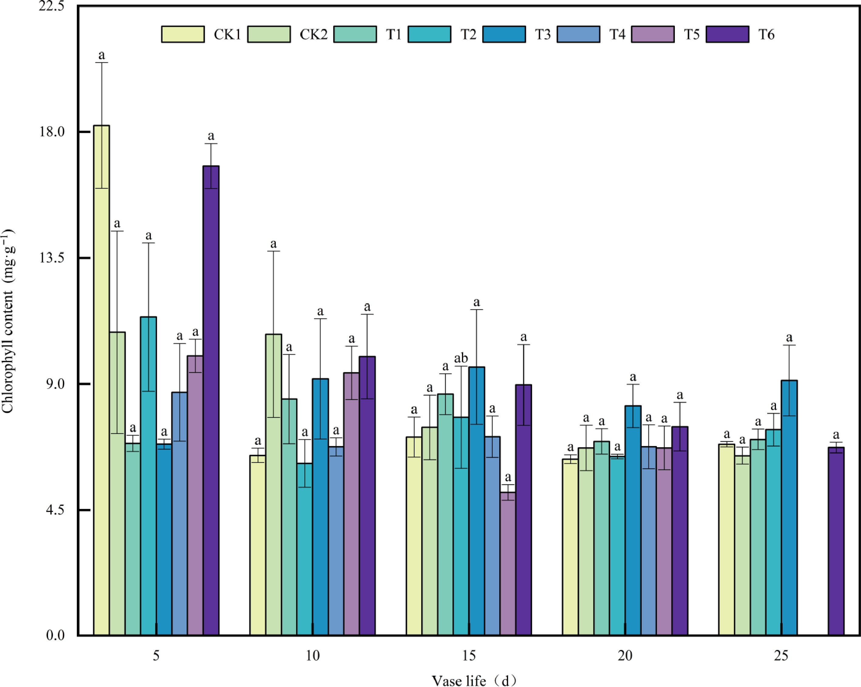 • Chlorophyll is an essential pigment for maintaining photosynthesis and the green coloration of floral organs in plants. Its content plays a pivotal role in determining the ornamental value and vase life of cut Anthurium flowers. As chlorophyll degradation is closely associated with the senescence process, changes in its content serve as an important physiological indicator of cut flower aging. Chlorophyll content showed dynamic changes among treatments throughout the vase period (Fig. 5). On Day 5, CK1 and T6 displayed the highest chlorophyll levels, whereas T1 and T3 were the lowest. By Day 10, most treatments experienced a decline, with T6 and T1 retaining relatively higher values. At day 15, T3 reached the peak chlorophyll content, followed by T6, while T5 showed the lowest level. On Day 20, chlorophyll slightly decreased across treatments, ranging from CK1 to T3. By Day 25, T3 maintained the highest content, with other treatments between 6.44 and 7.37 mg·g−1. Overall, chlorophyll content dropped sharply during the early stage, fluctuated moderately during the mid-stage, and stabilized in the late stage, with T3 and T6 retaining comparatively higher levels.