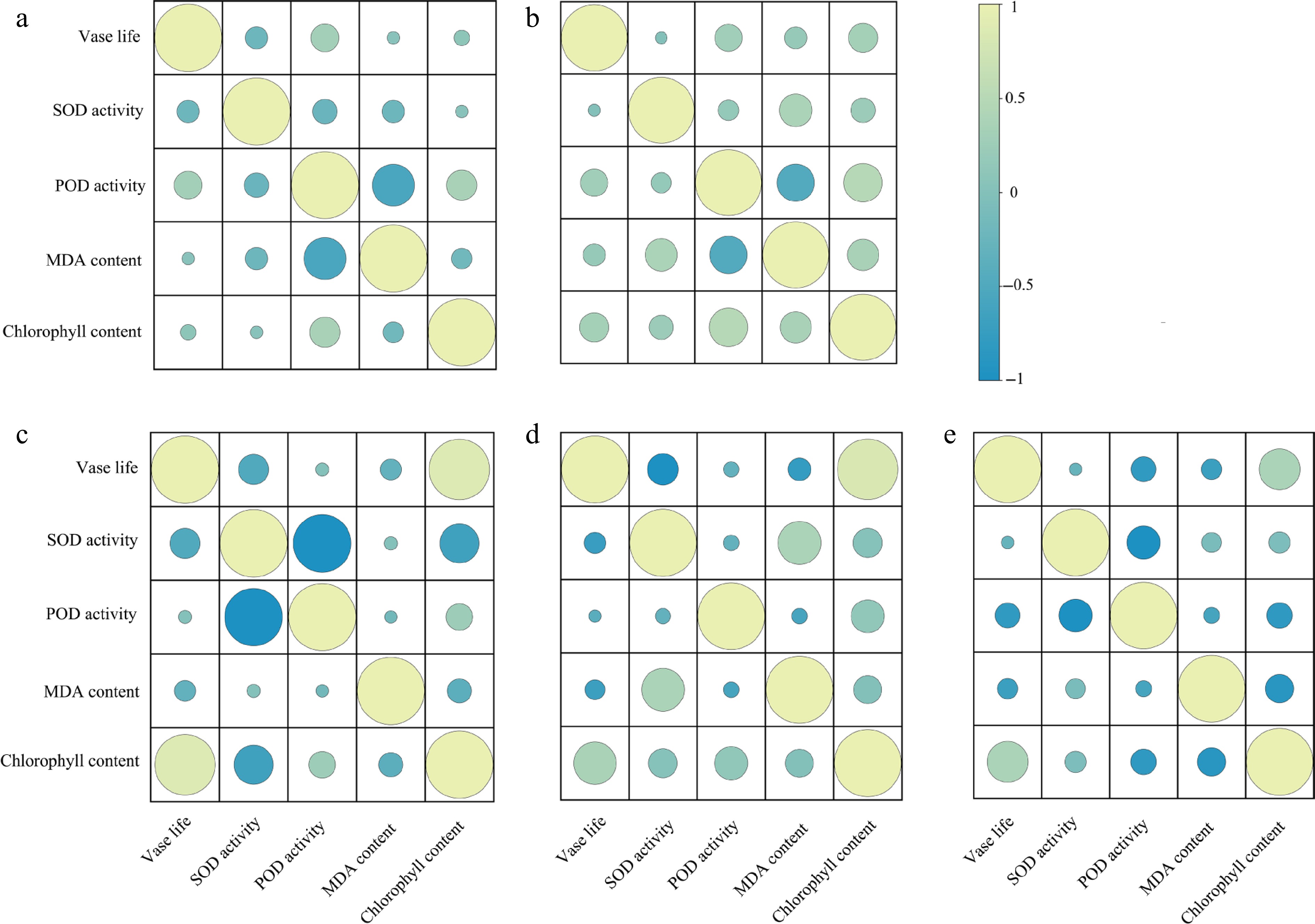 • Pearson's correlation coefficients were calculated between vase life and the physiological parameters SOD activity, POD activity, MDA content, and chlorophyll content using SPSS version 27.0. The correlation matrices were visualized as heatmaps with color gradients generated through the Chiplot online platform at www.chiplot.online.