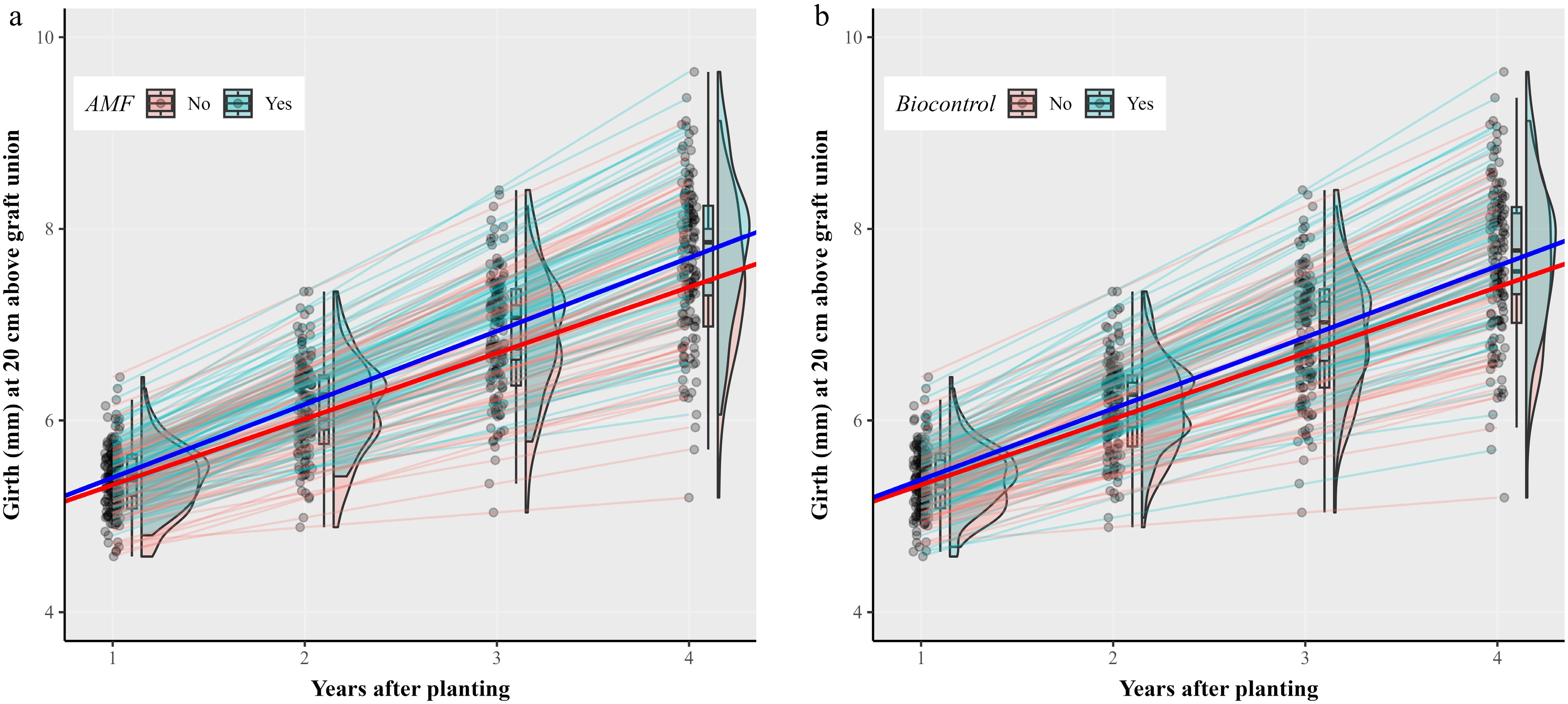 Fitted random intercept and coefficient models describing the girth increase over time of individual trees in relation to amendment with a single AMF strain or biocontrol agents (BCAs) at planting in a 2 × 2 × 2 factorial design of soil amendment (AMF [yes, no], BCA [yes, no] and plant growth-promoting rhizobacteria [yes, no]). There were significant main effects of amending soils with AMF (p < 0.01) or BCA (p < 0.05), increasing the annual girth expansion rate (the thick blue and red lines represents the main effect). Thin lines are the fitted models for individual trees. The density plots show the annual girth distribution patterns of those trees with and without (a) AMF, or (b) BCA amendment. Trees of the apple cultivar Gala, grafted onto the M9 rootstock, were planted in April 2020.