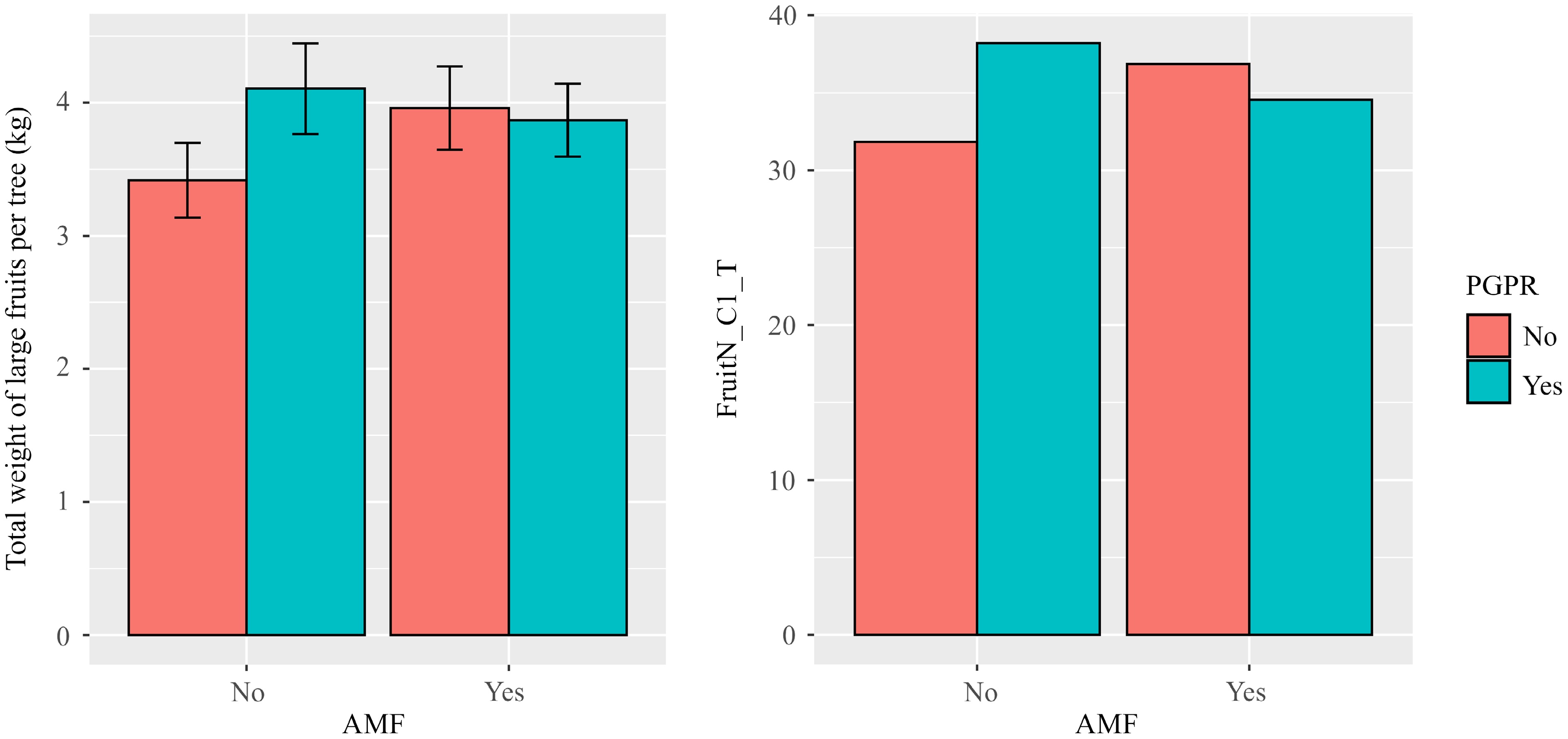 Table 2 shows the results of linear mixed model analysis when fruit production was analysed separately for each year. There was an indication that amending soils with BCAs at planting increased the total weight of large fruits (p < 0.1) in 2021, increasing fruit weight from an average of 2.7 to 3.0 kg/tree. Similarly, AMF amendment appeared to have increased (p < 0.1) both the number and weight of large fruits in 2022: 3.1 vs 2.0, and 0.35 kg vs 0.23 kg per tree. There was also an indication of interactions between AMF and PGPR for both the weight and number of large fruits in 2023 (p < 0.1, Table 2)—joint amendment with AMF and PGPR led to reduced fruit production.