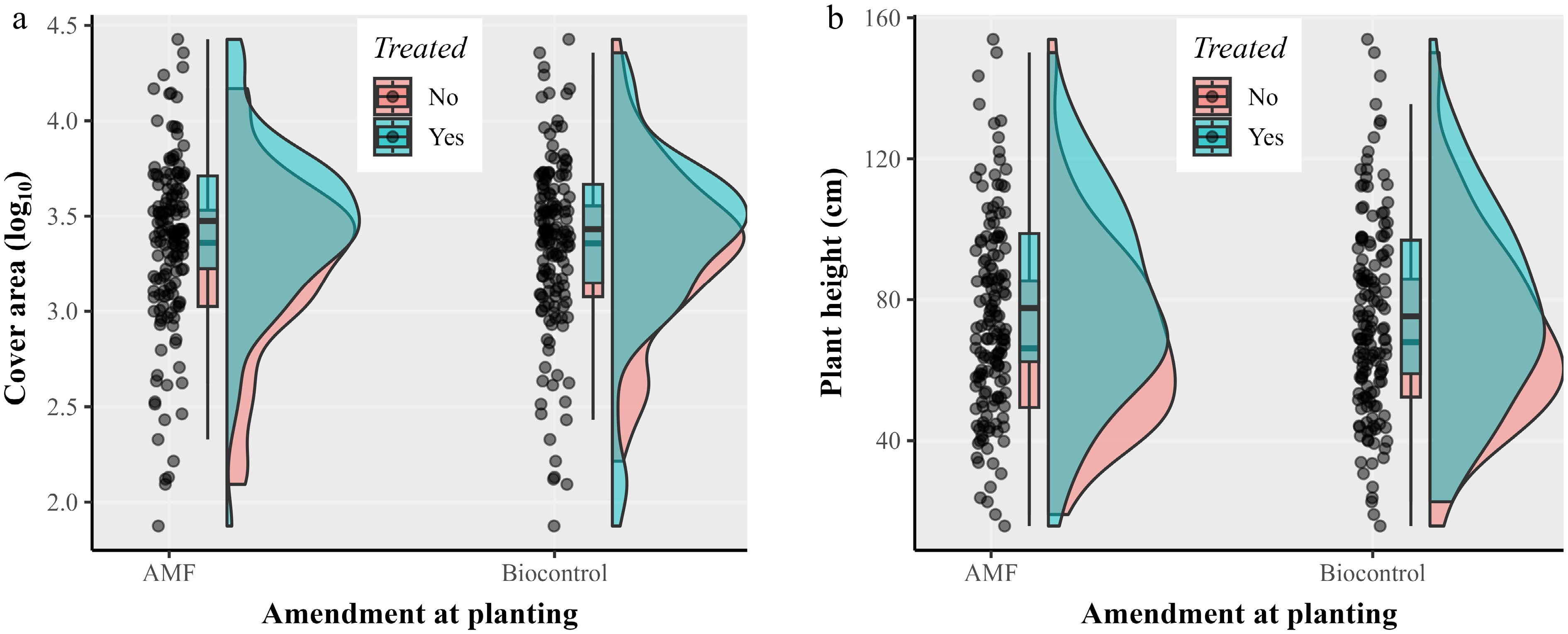 The distribution of untransformed canopy cover area was extremely skewed, and logarithmically transformed values were close to normal distributions (Fig. 4a). Only the main effect of AMF amendment at planting led to a significant (p < 0.01) increase in the estimated canopy area (Fig. 3a, Table 2): 2968 (± 353.7) vs 4293 (± 531.8). The overall positive effect of amending soils with BCAs was also close to statistical significance (p < 0.1, Table 2). For plant height, only the main effect of single AMF-strain amendment was significant (p < 0.01, Table 2), on average increasing plant height from 68.6 (± 2.92) cm (without amendment) to 80.9 (± 3.12) cm (with amendment).