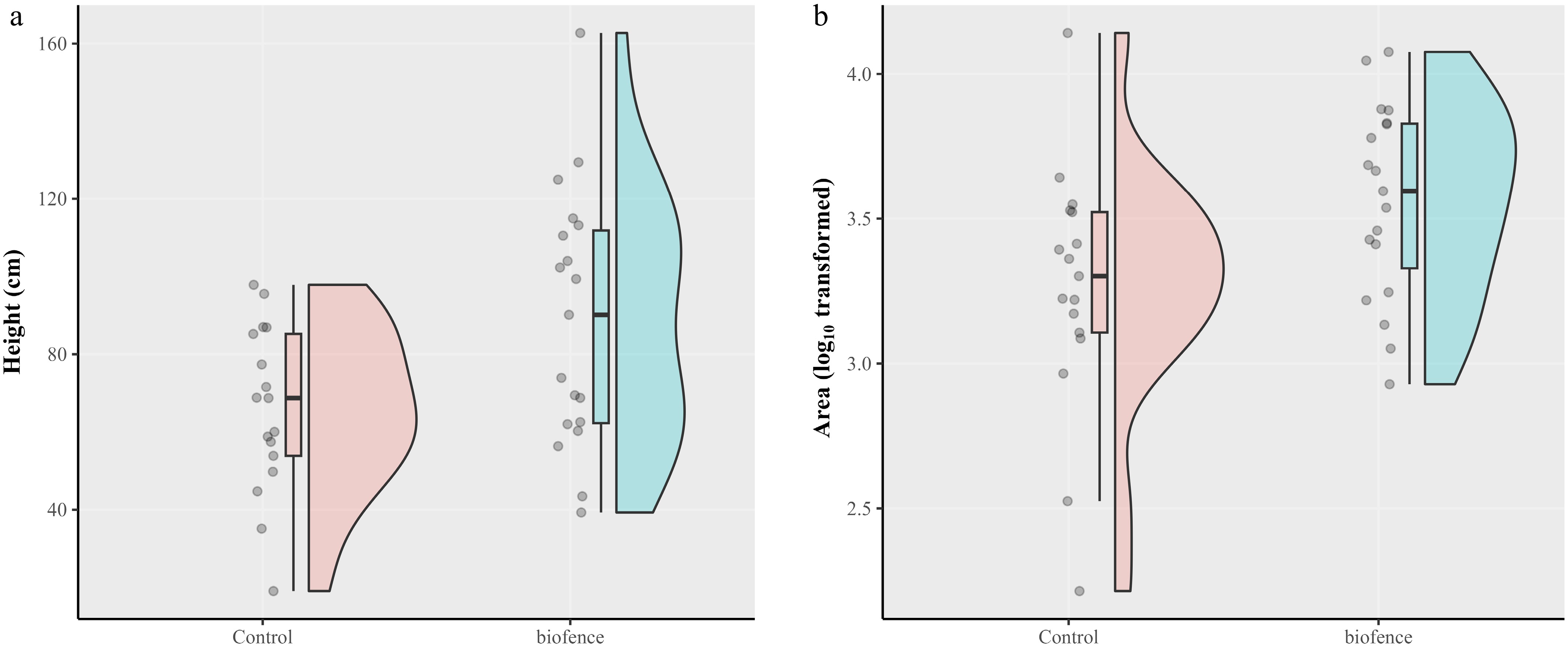 Scatter and density plots depicting distribution of (a) estimated tree height (cm), and (b) projected canopy cover area via analysis of drone-captured images in October 2023 for the untreated and Biofence soil amendment. Trees of the apple cultivars Gala, grafted onto M9 rootstocks, were planted with various soil amendment treatments in April 2020; there were 20 replicate trees per treatment. Biofence amendment significantly (p < 0.01) increased both plant height and projected canopy cover.