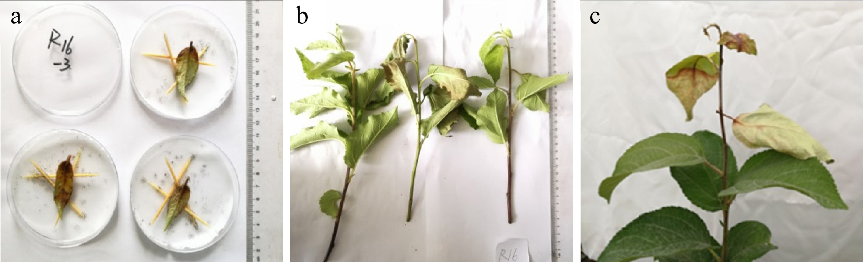• Nineteen types of Malus plants were obtained from the National Pear and Apple Germplasm Repository (Xingcheng, China) (Table 1). In May 2019, the plants were grafted onto 'Malus baccata (L.) Borkh.' and were sent to Korla, Xinjiang, for pot cultivation. In May 2020, leaves and shoots were collected for inoculation in vitro, and at the same time, inoculation was carried out on plants in vivo in the field.
