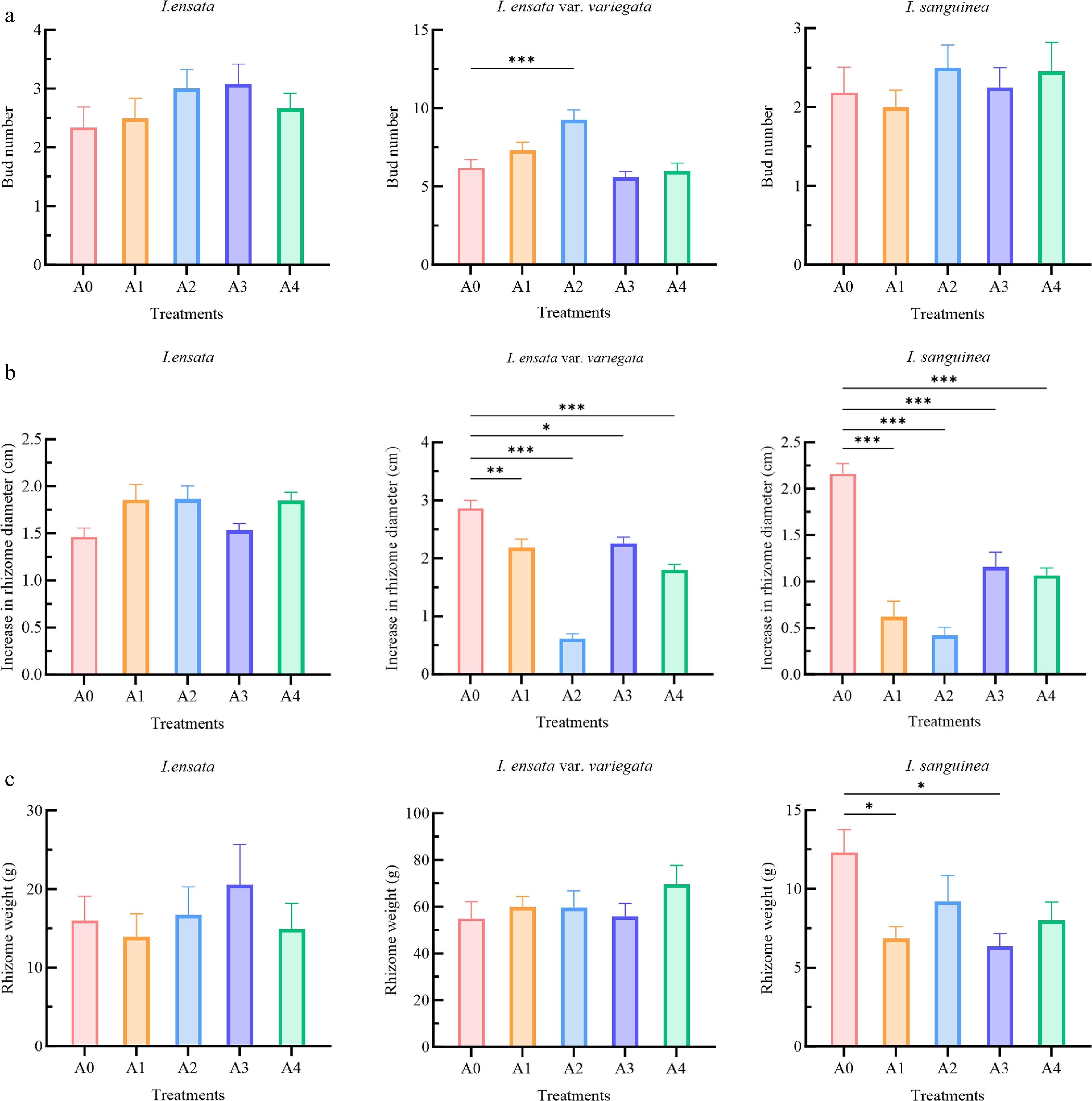 Effects of plant growth regulator treatments on (a) bud number, (b) increase in rhizome diameter, and (c) rhizome weight in three Iris species (I. ensata, I. ensata var. variegata, and I. sanguinea). The treatments included: A0 (control group), A1 (low concentration of 6-BA, 1,000 mg/L), A2 (high concentration of 6-BA, 2,000 mg/L), A3 (low concentration of PC, 500 mg/L), and A4 (high concentration of PC, 1,000 mg/L). Each bar represents the mean (n = 12) ± standard error. The significant differences within each species compared to the A0 (control group) were analyzed using Tukey's HSD test following one-way ANOVA (* p < 0.05, ** p < 0.01, *** p < 0.001).
