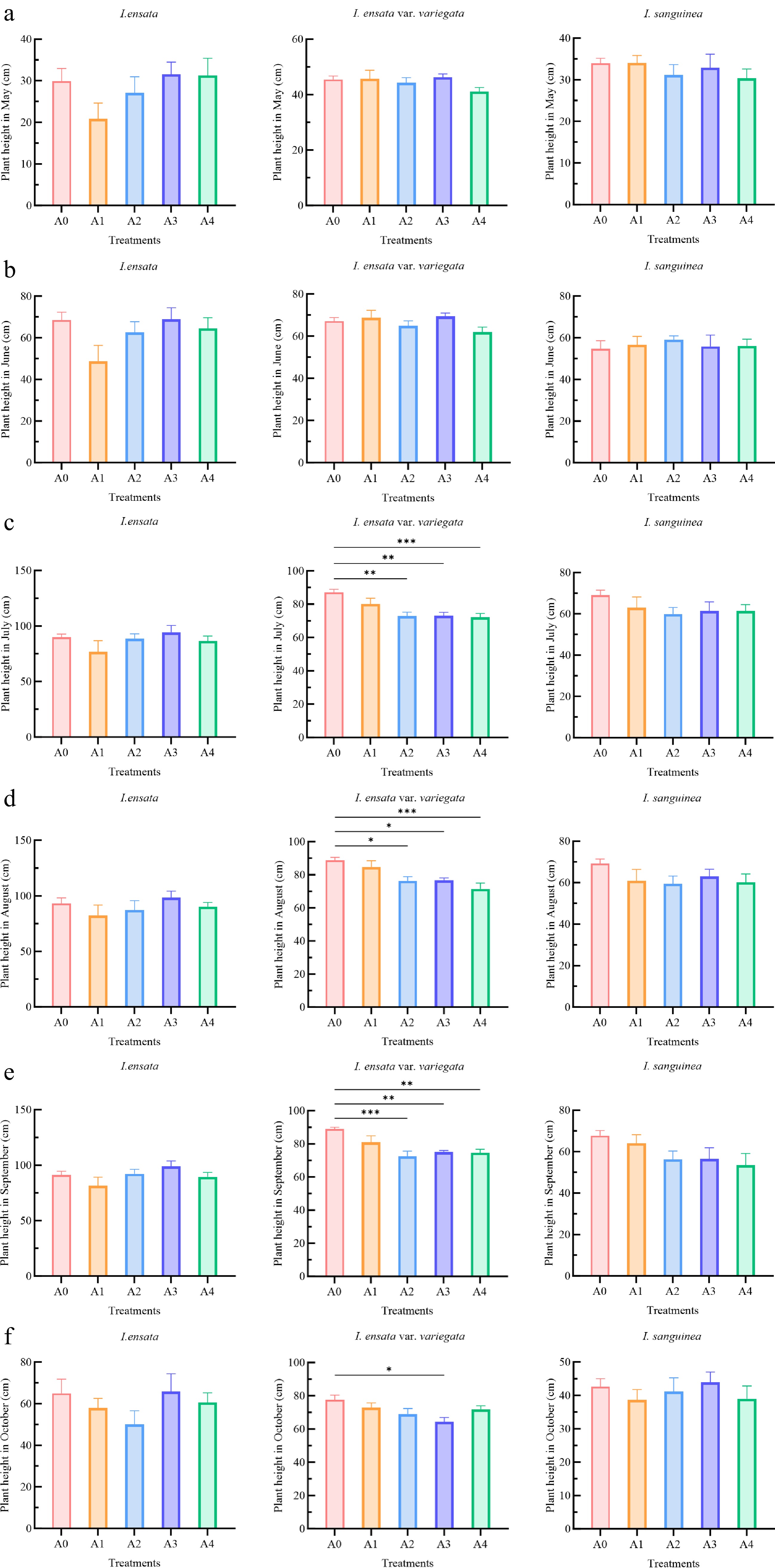 Effects of plant growth regulator treatments on plant height of three Iris species (I. ensata, I. ensata var. variegata, and I. sanguinea) during the growing season. The treatments included: A0 (control group), A1 (low concentration of 6-BA, 1,000 mg/L), A2 (high concentration of 6-BA, 2,000 mg/L), A3 (low concentration of PC, 500 mg/L), and A4 (high concentration of PC, 1,000 mg/L). (a) May; (b) June; (c) July; (d) August; (e) September; and (f) October. Each bar represents the mean (n = 12) ± standard error. The significant differences within each species compared to the A0 (control group) were analyzed using Tukey's HSD test following one-way ANOVA (* p < 0.05, ** p < 0.01, *** p < 0.001).