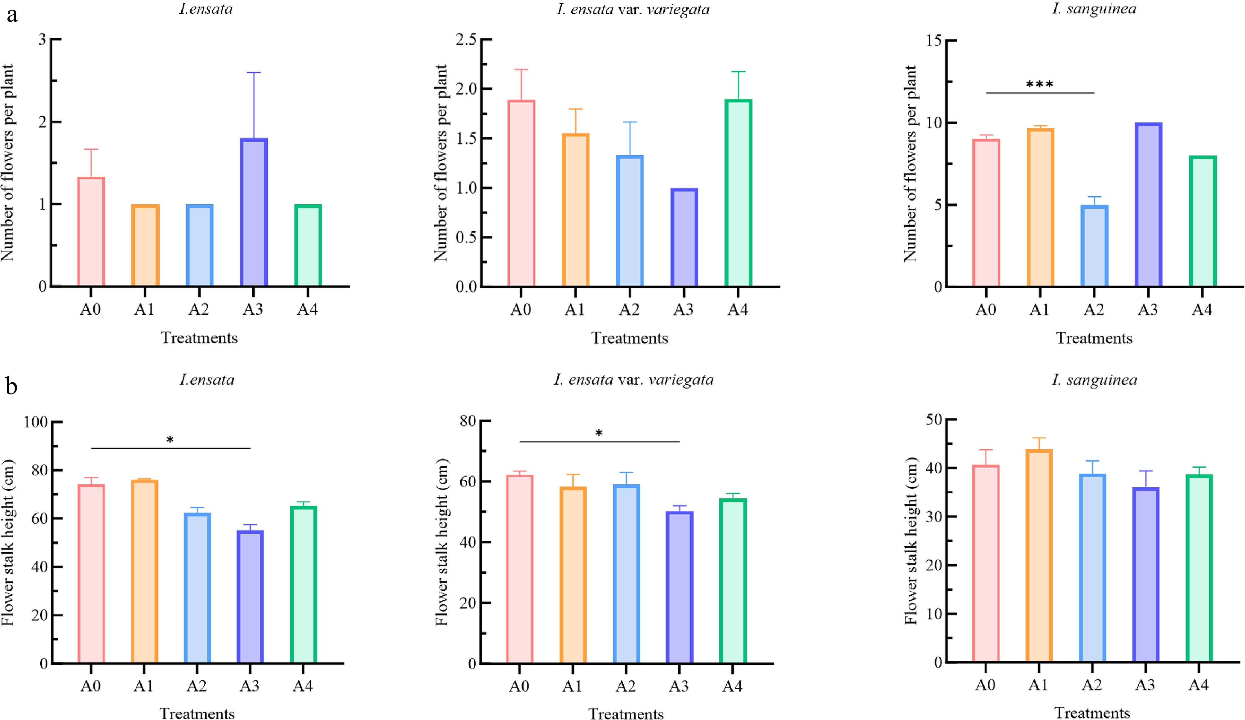 Effects of plant growth regulator treatments on (a) number of flowers per plant, and (b) flower stalk height in three Iris species (I. ensata, I. ensata var. variegata, and I. sanguinea). The treatments included: A0 (control group), A1 (low concentration of 6-BA, 1,000 mg/L), A2 (high concentration of 6-BA, 2,000 mg/L), A3 (low concentration of PC, 500 mg/L), and A4 (high concentration of PC, 1,000 mg/L). Each bar represents an average (n = 12) ± standard error. The significant differences within each species compared to the A0 (control group) were analyzed using Tukey's HSD test following one-way ANOVA (* p < 0.05, ** p < 0.01, *** p < 0.001).