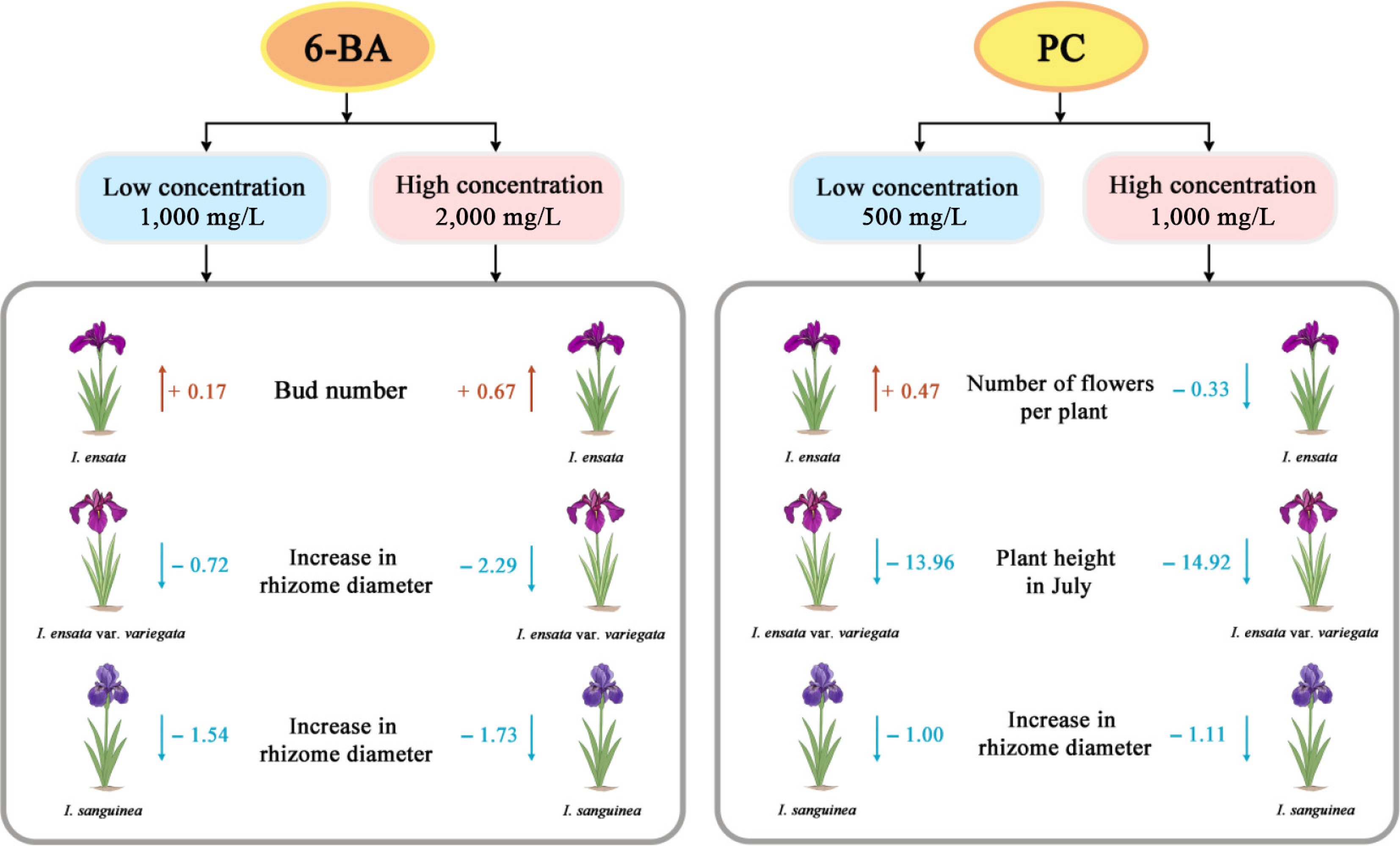 In this study, three preferred wetland Iris species, including I. ensata, I. ensata var. variegata, and I. sanguinea, were selected as research subjects, which was based on their suitability for horticultural cultivation and landscape applications in Hangzhou, China. The research aims to investigate the effects of varying concentrations of 6-BA and PC on key growth characteristics of these species, such as bud number, plant height, increase in rhizome diameter, rhizome weight, and flowering performance. By comparing these parameters under different treatments, the study seeks to evaluate how 6-BA and PC influence the growth and development of wetland irises. The findings will provide valuable insights for optimizing the cultivation practices of wetland irises in the Hangzhou region. Furthermore, this research will contribute to theoretical knowledge on the effective use of PGRs for improving the ornamental and functional traits of wetland irises, offering practical guidance for their application in landscape design.