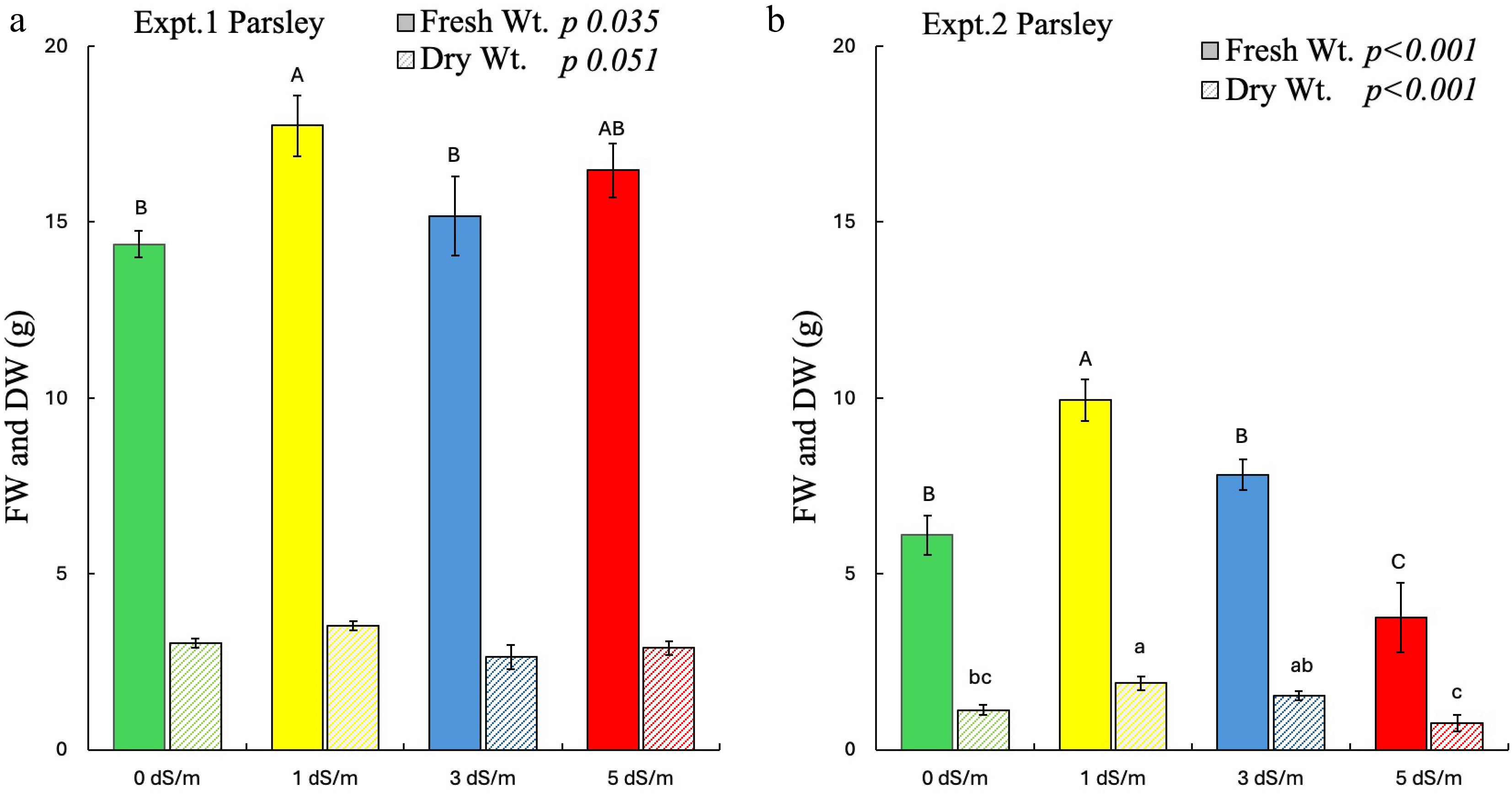 Effect of salinity on fresh weight (FW) and dry weight (DW) of parsley in experiments 1 and 2. Different uppercase letters indicate significant effects of salinity on FW, whereas lowercase indicates significant effect of salinity on DW at p ≤ 0.05. The error bars represent ± 1 standard error of the mean (n = 10). The solid bar represents FW, and the striped bar represents DW. Italic text shows the significant impact of salinity on the measured parameters.