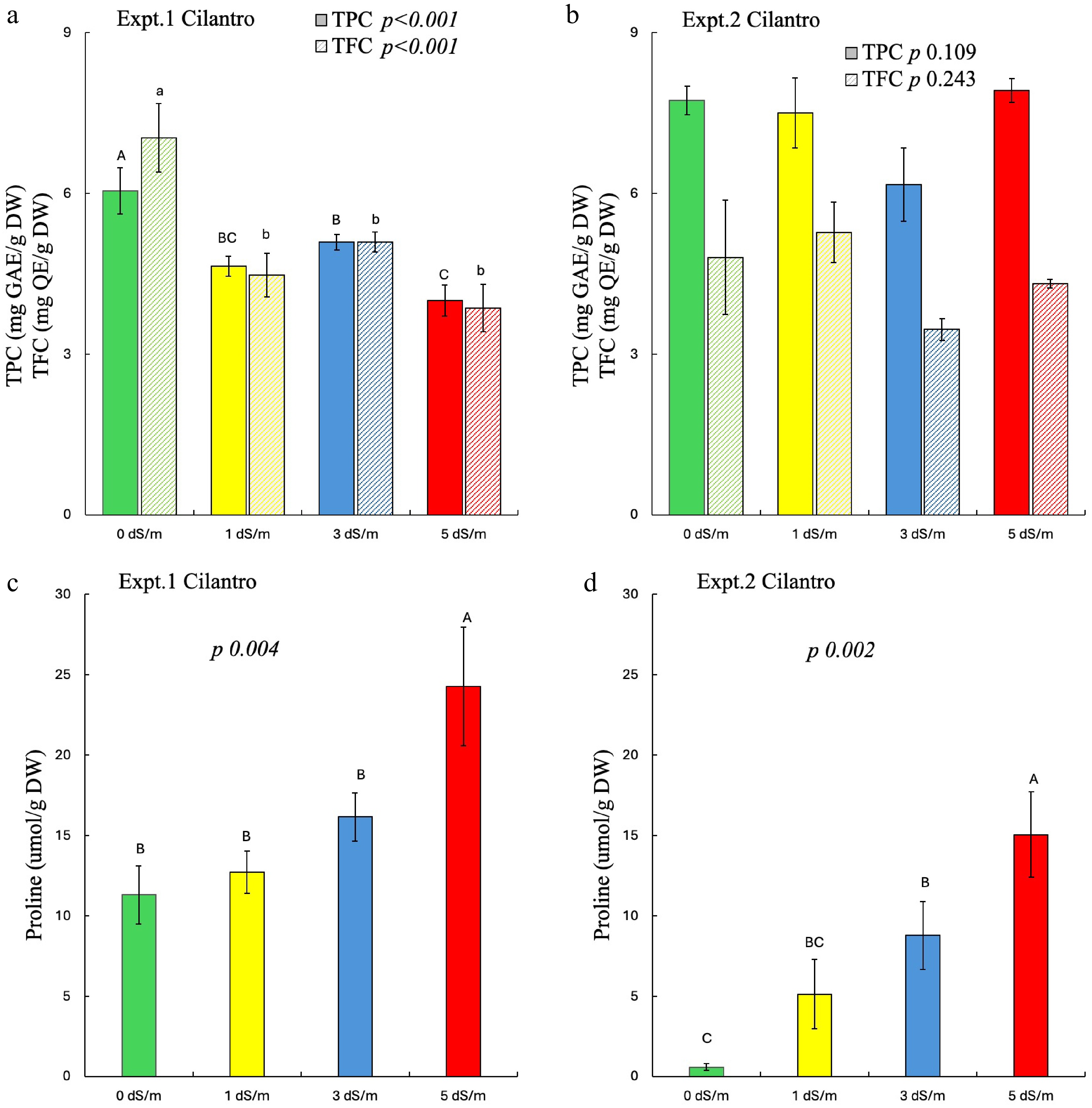 Salinity significantly affected TPC and TFC of cilantro in experiment 1, but it did not affect the phytochemicals in experiment 2 (Fig. 3a, b). Overall, greater proline content was found in experiment 1 as compared to experiment 2 (3C and 3D). In experiment 1, greater TPC and TFC were found in control plants with reduced phytochemicals in salinity-treated plants. Higher salinity also significantly and proportionally increased the proline content in cilantro in both experiments.