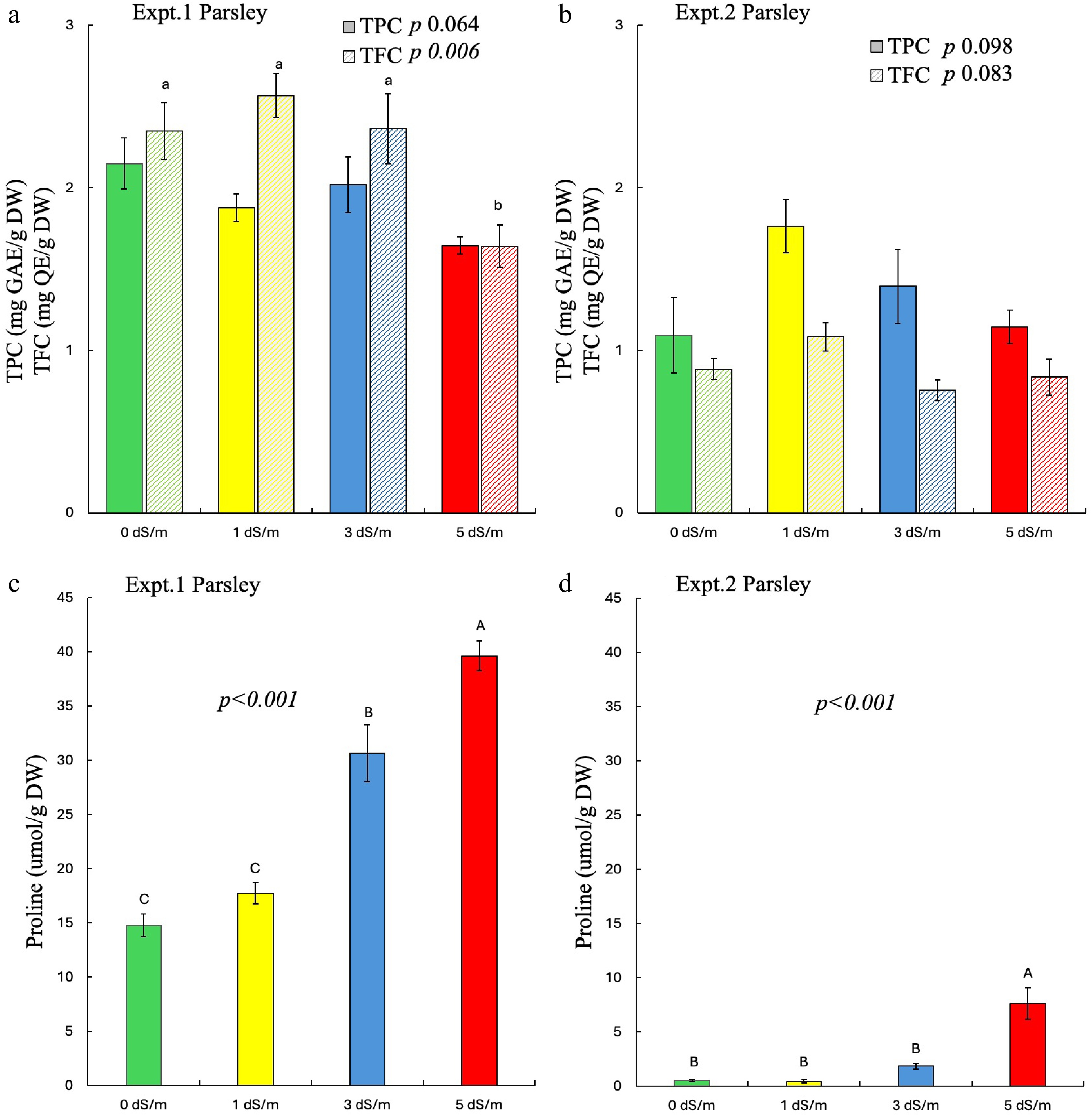 In parsley, salinity significantly affected the TFC in experiment 1 with no significant effects seen in experiment 2 (Fig 4a, b). As seen with cilantro, greater proline content was found in experiment 1 as compared to experiment 2. Parsley treated with 5 dS/m salinity showed significantly reduced TFC in experiment 1, with no difference among other treatments. Conversely, salinity did not affect the TPC of parsley in both experiments. Like cilantro, proline content significantly increased with increased salinity in parsley across both experiments (Fig. 4c, d).