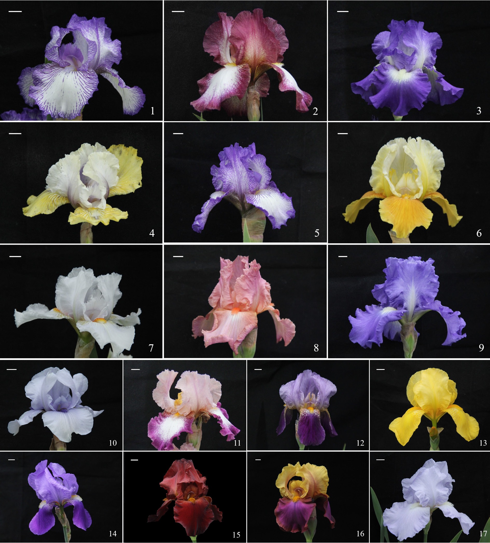 Bearded iris cultivars used in this study. Cultivar codes 1 to 17 correspond to the 17 bearded iris cultivars listed in Table 1. Bars = 1 cm.